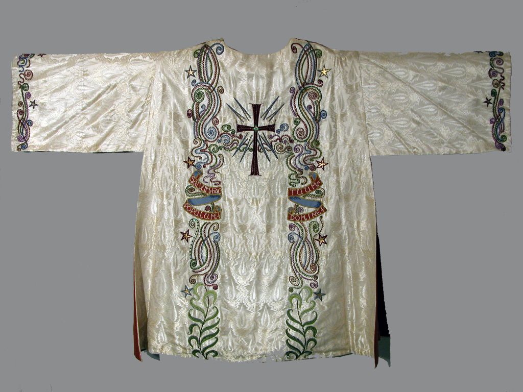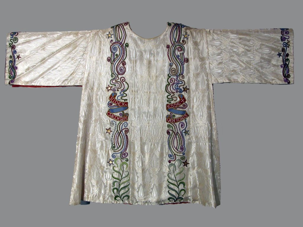 Witte dalmatiek met geborduurd kruis, ranken en sterren en banderol met "Salvum fac populum ..."