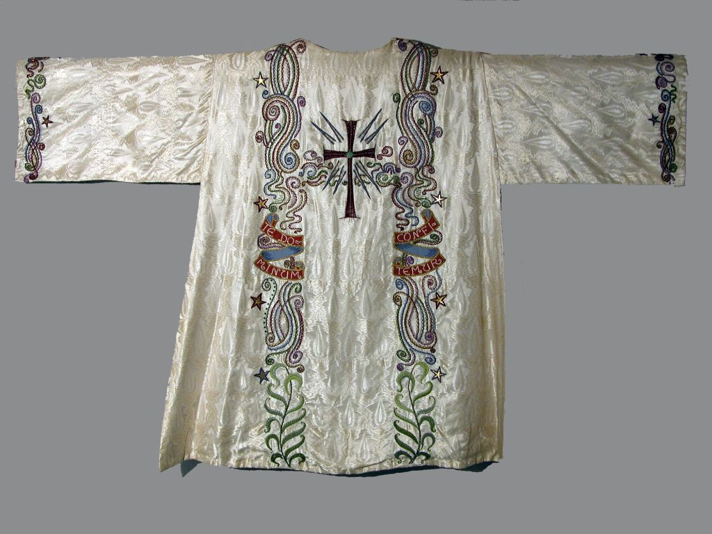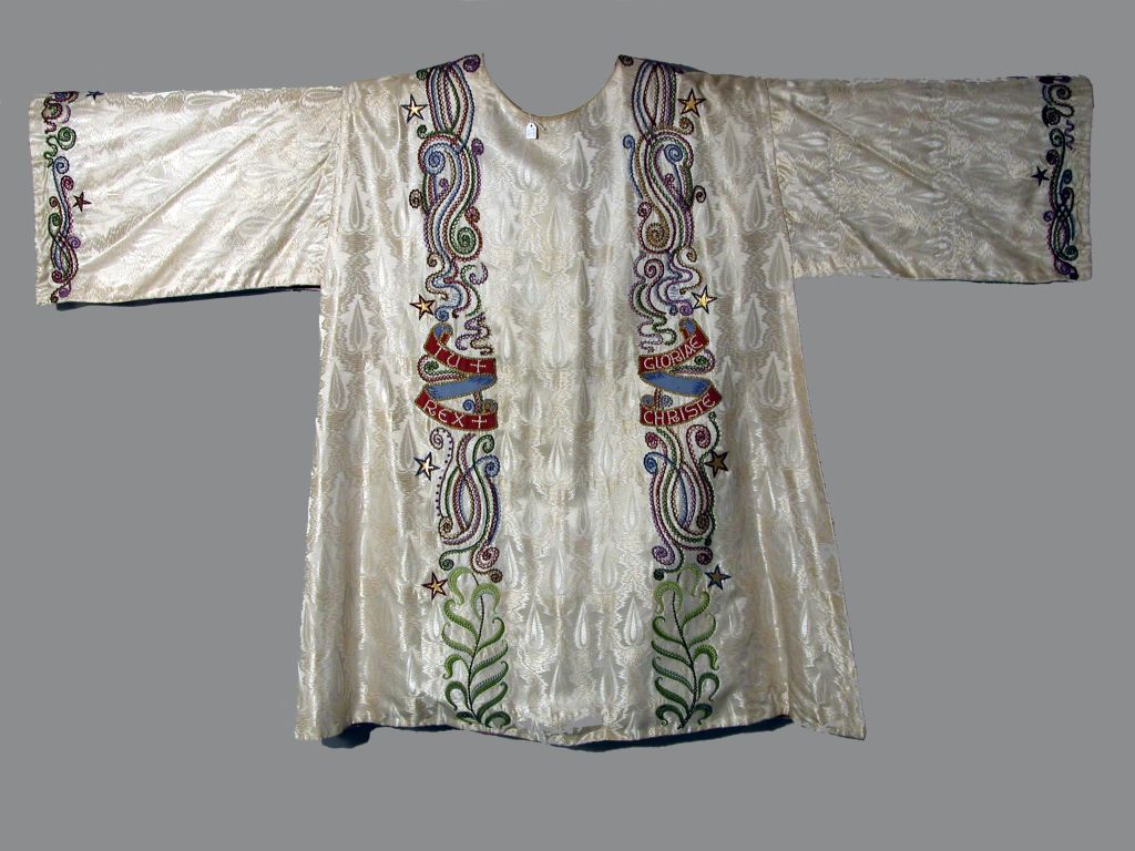 Witte dalmatiek met geborduurd kruis, ranken en sterren en banderol met "Tu rex gloriae Christe"