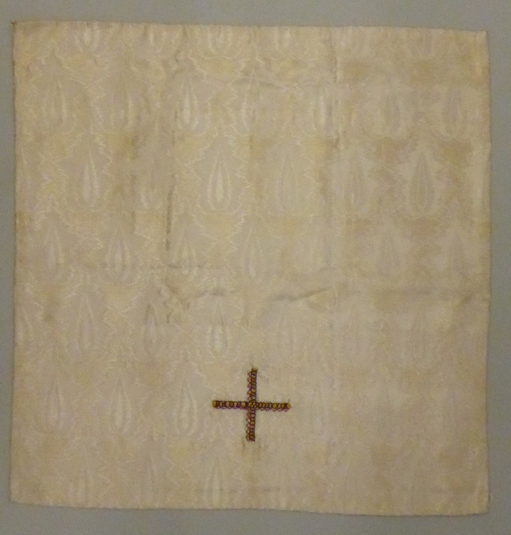 Wit velum met ingeweven vlammotief, goud-paars kruisje