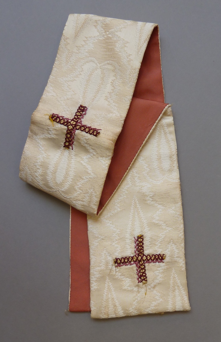 Witte manipel met ingeweven vlammotief, goud-paarse kruisjes