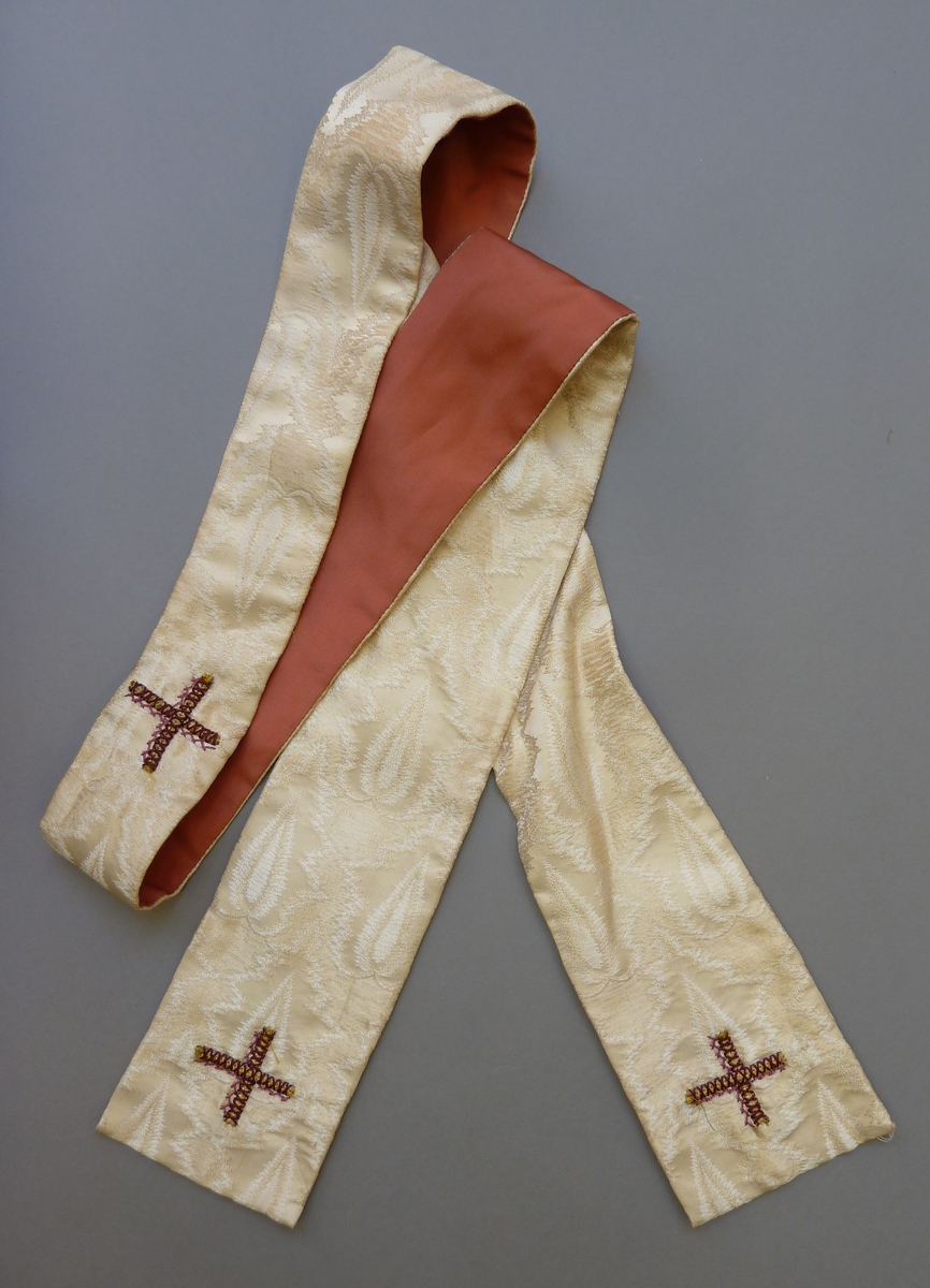 Witte stola met ingeweven vlammotief, rood-gouden geborduurde kruisjes