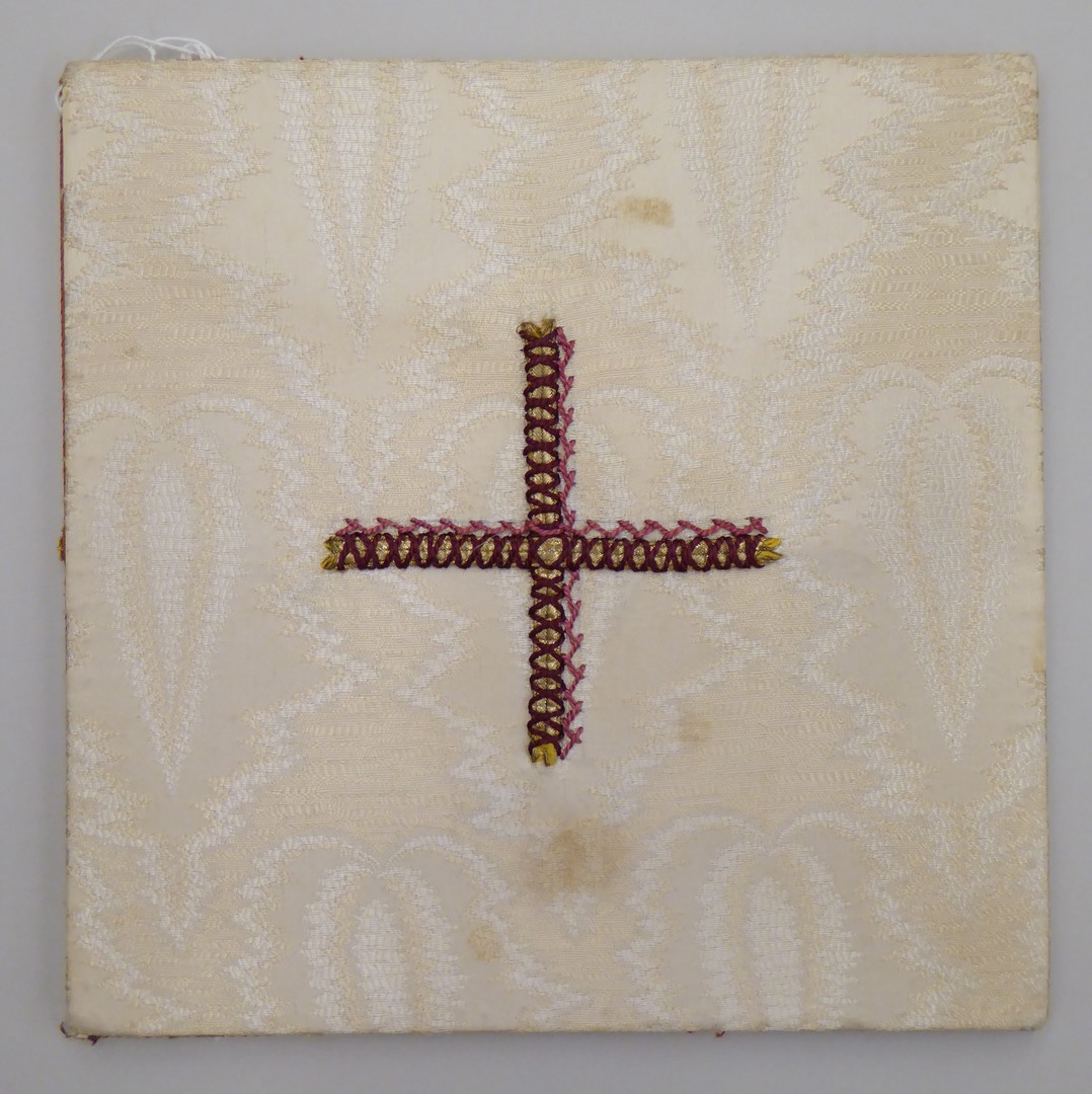Witte beurs met ingeweven vlammotief, rood-roze-goud geborduurd kruisje