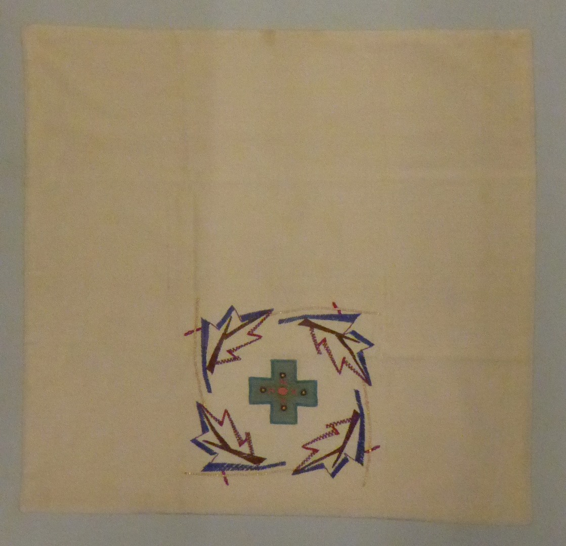Wit kelkvelum met blauw kruis omringd door geborduurde bladeren