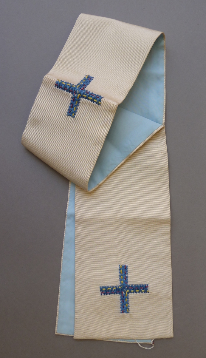 Witte manipel met blauw-geel-roze geborduurde kruisjes