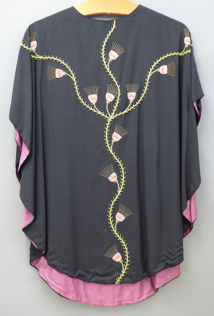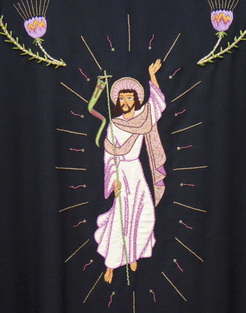 Zwart kazuifel geborduurd met distelranken en Christus met kruisvaan