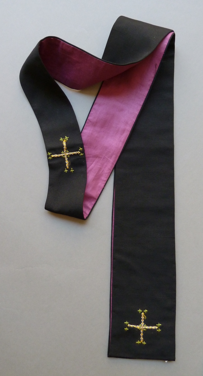 Zwarte stola met drie geel-grijs-groen geborduurde kruisjes