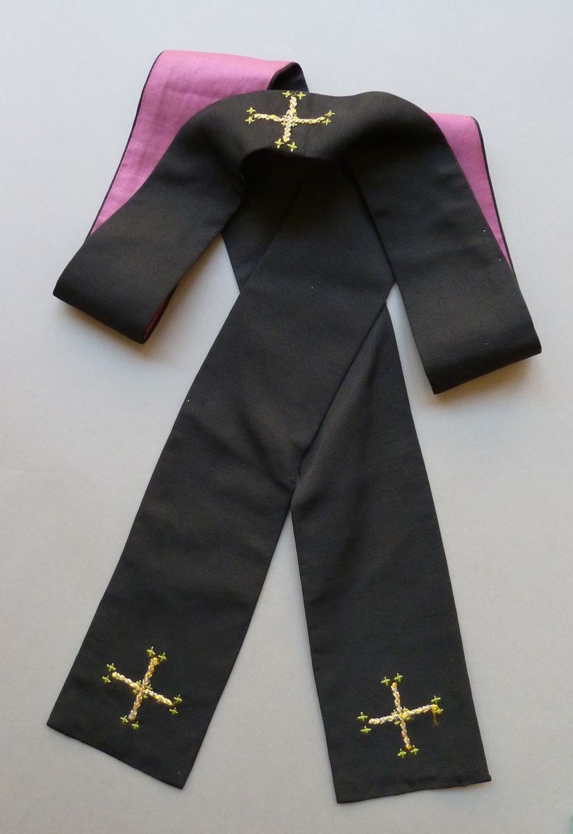 Zwarte stola met geel-grijs-groen geborduurde kruisjes
