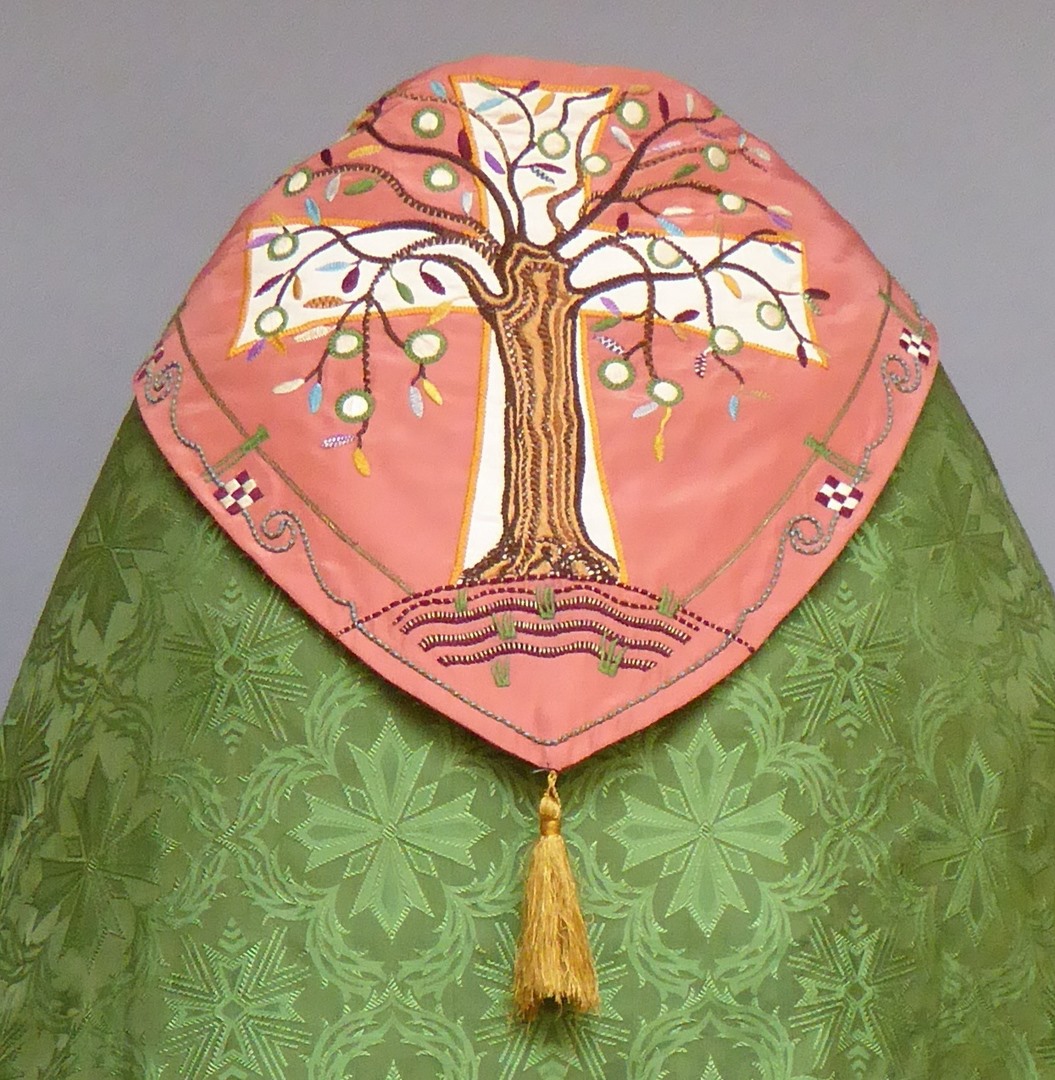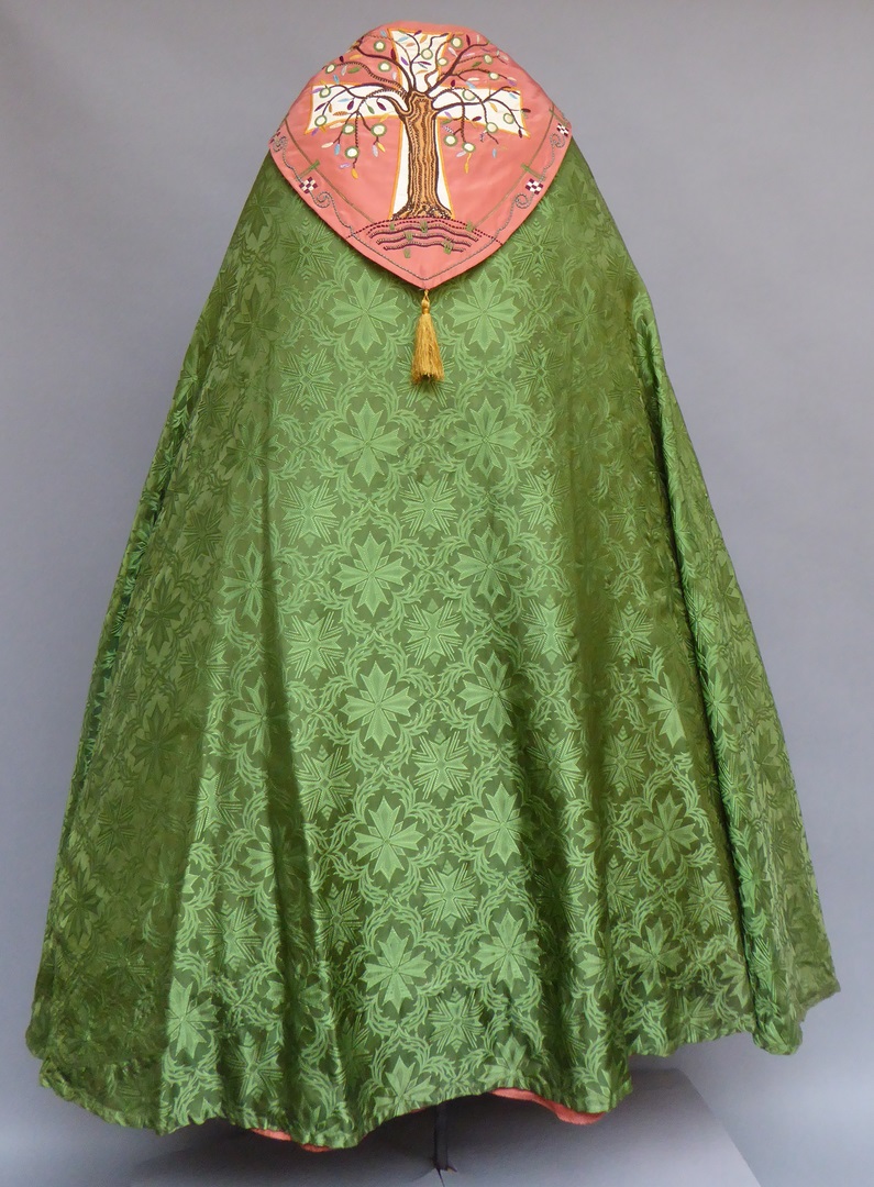 Groene koorkap met levensboom op roze schild