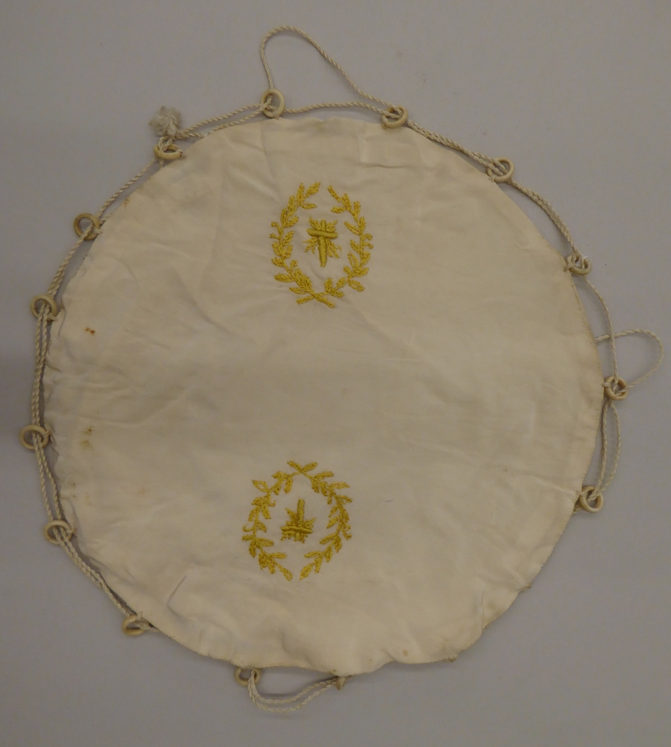 Witte ziekenbeurs geborduurd in geel met IHS, aan binnenzijde kruisjes