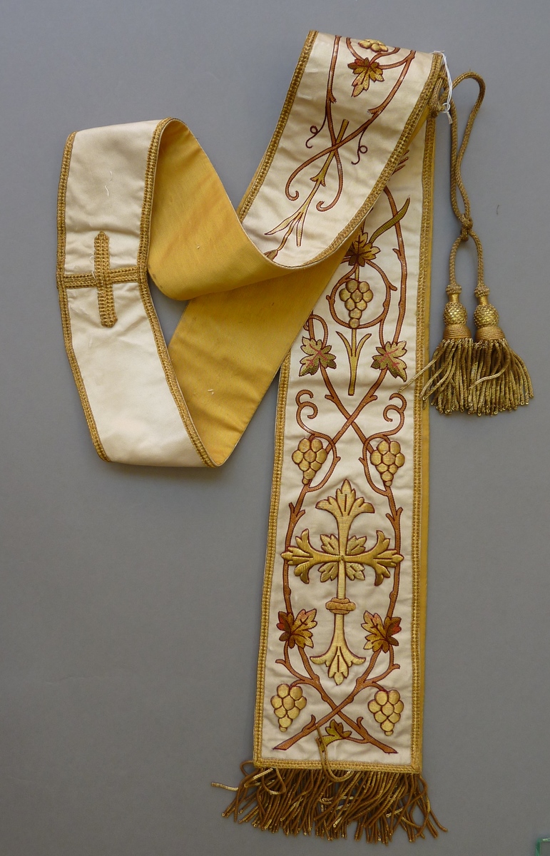 Witte stola met leliekruisen, druivenranken en aren van gehoogd gouddraad en floszijde