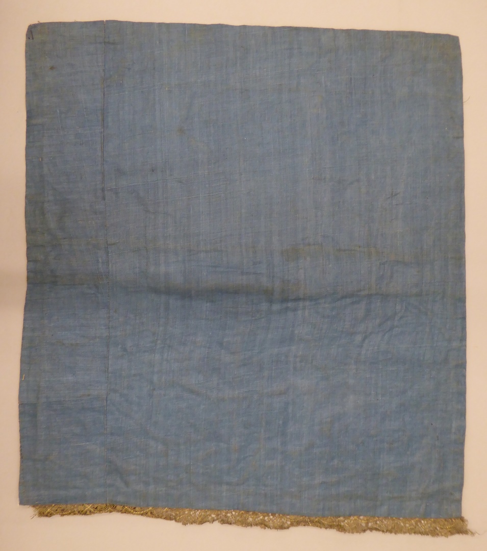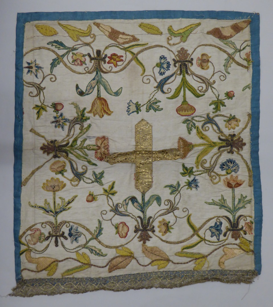Wit kelkvelum geborduurd met ranken van korenbloemen, tulpen, anjers