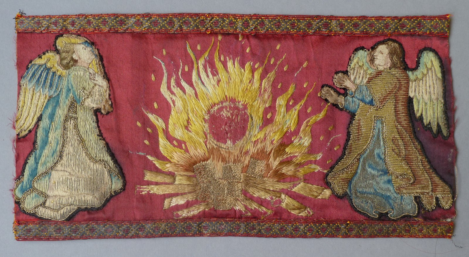 Borduursel van engelen met sacrament van mirakel op rode ondergrond