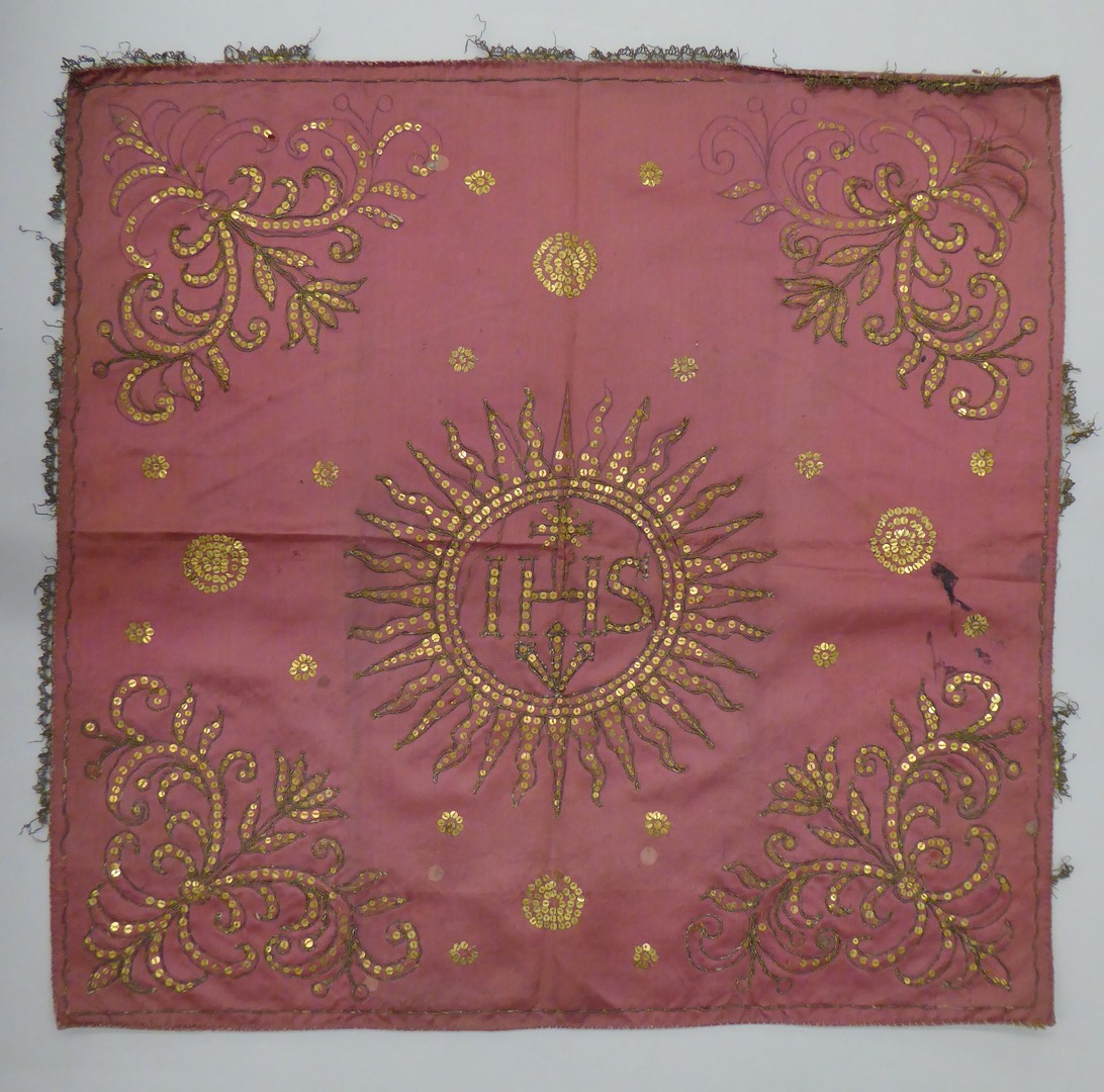 Rood kelkvelum met IHS in stralenkrans en rinceaux in de hoeken