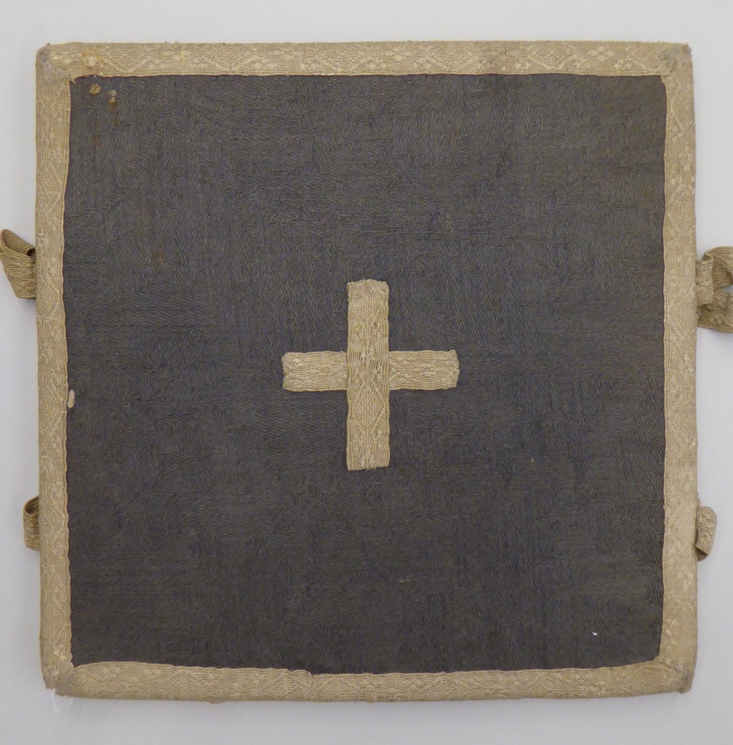 Zwarte (grijze) beurs met ingeweven bloemmotief, met kruisje en rand van wit galonband