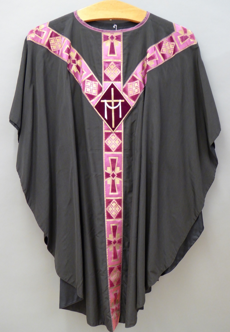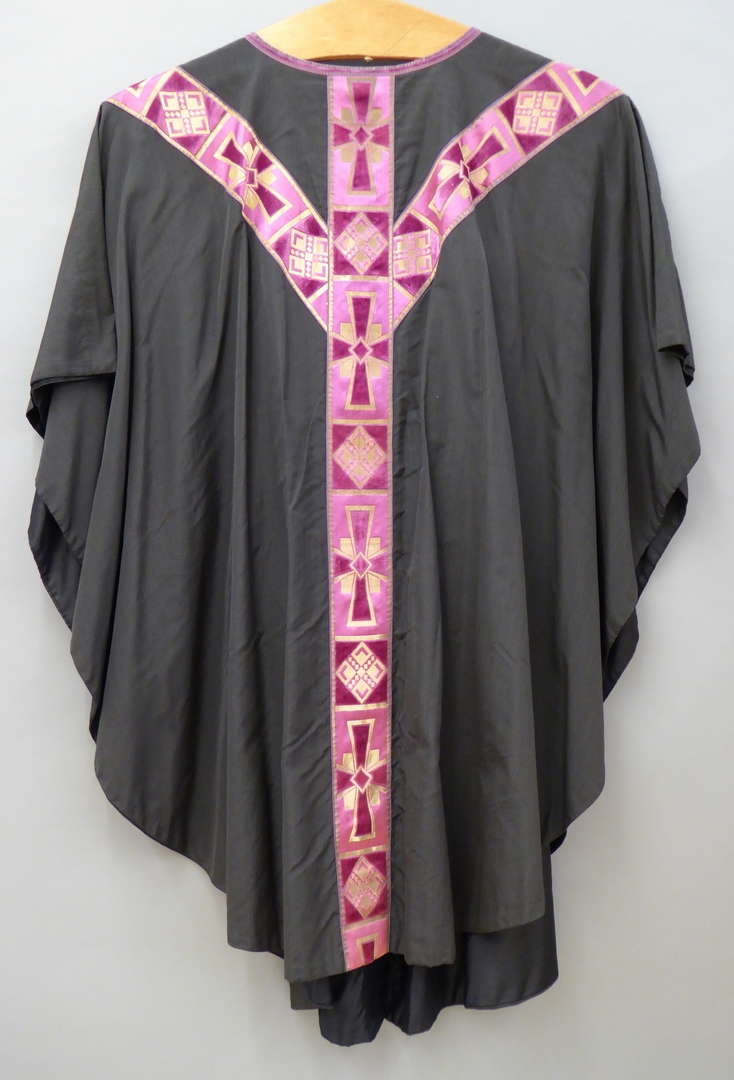 Zwart kazuifel met paars-goud gaffelkruis met ingeweven kruisen