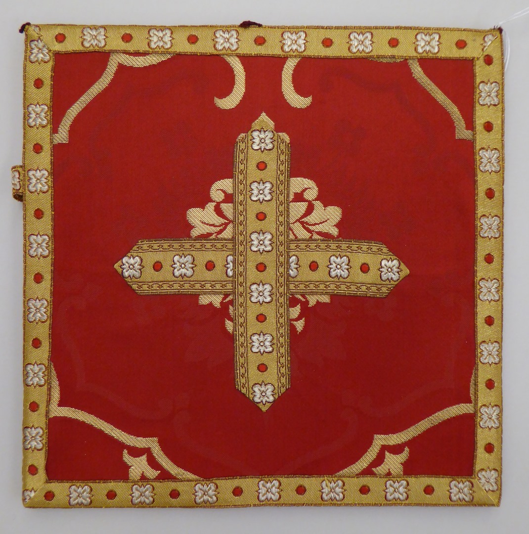 Rode beurs met ingeweven granaatappelpatroon, met kruis en rand van goudgalon