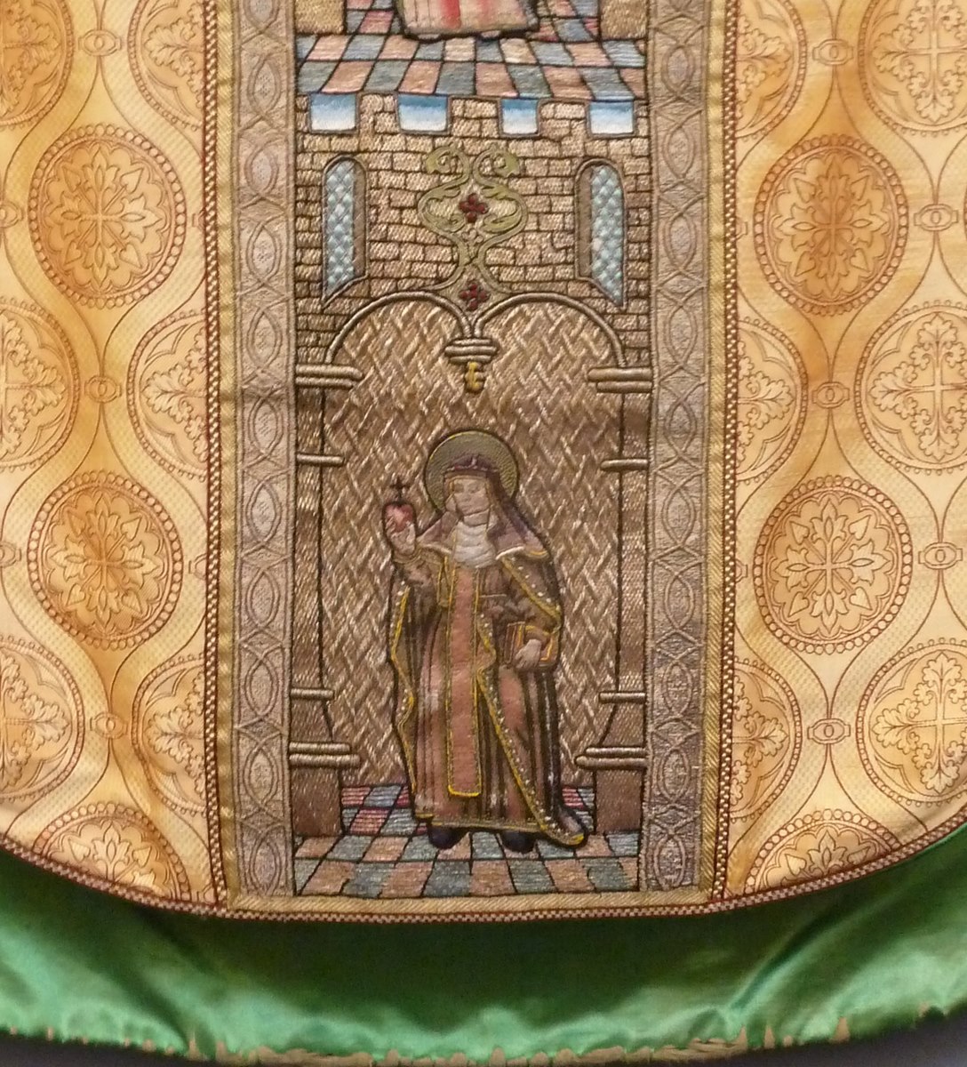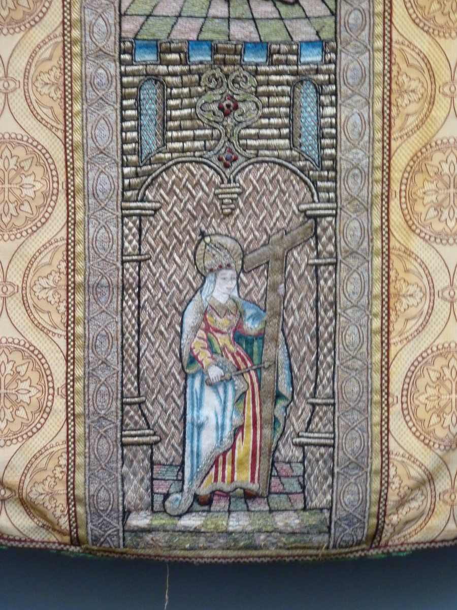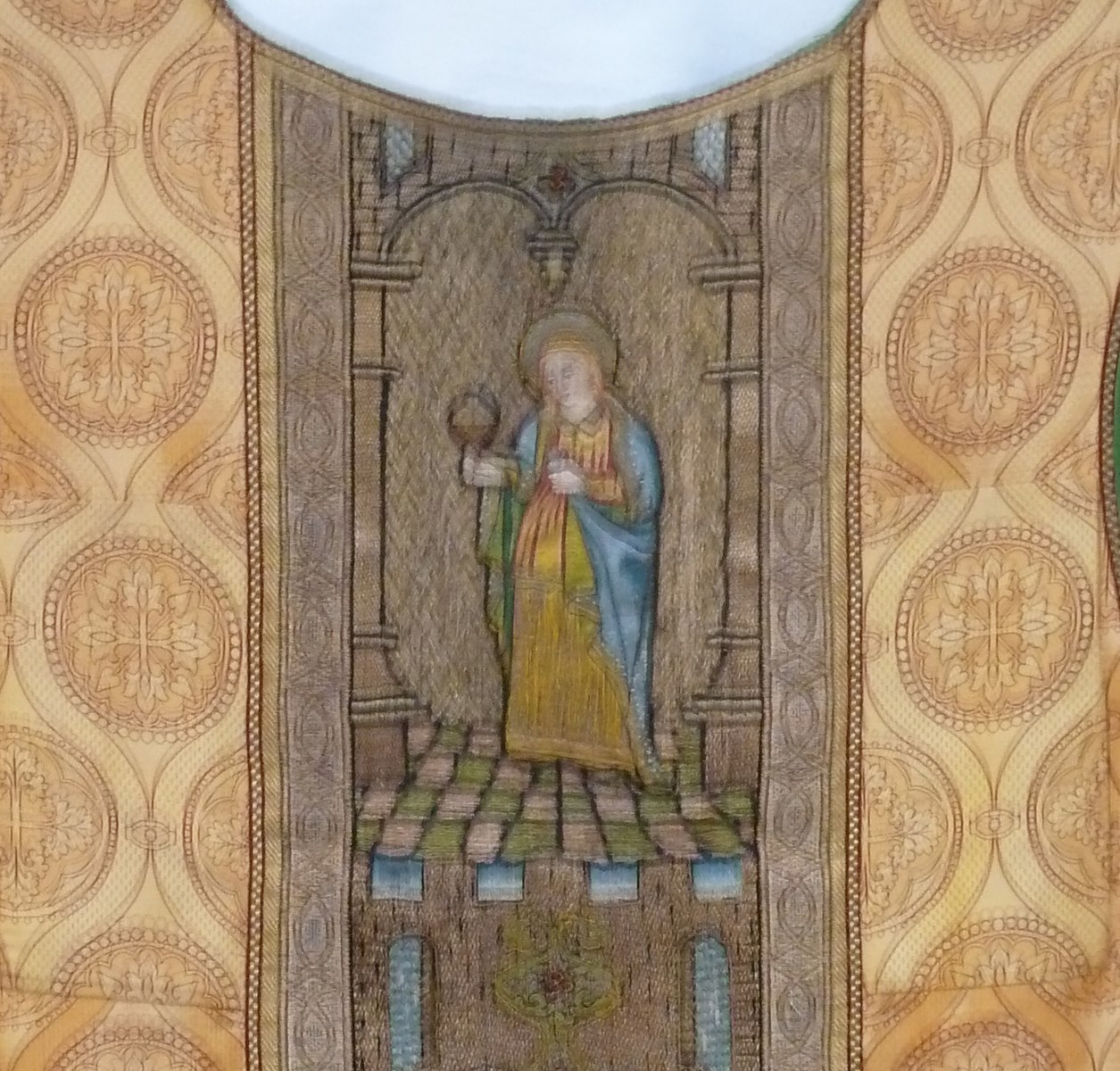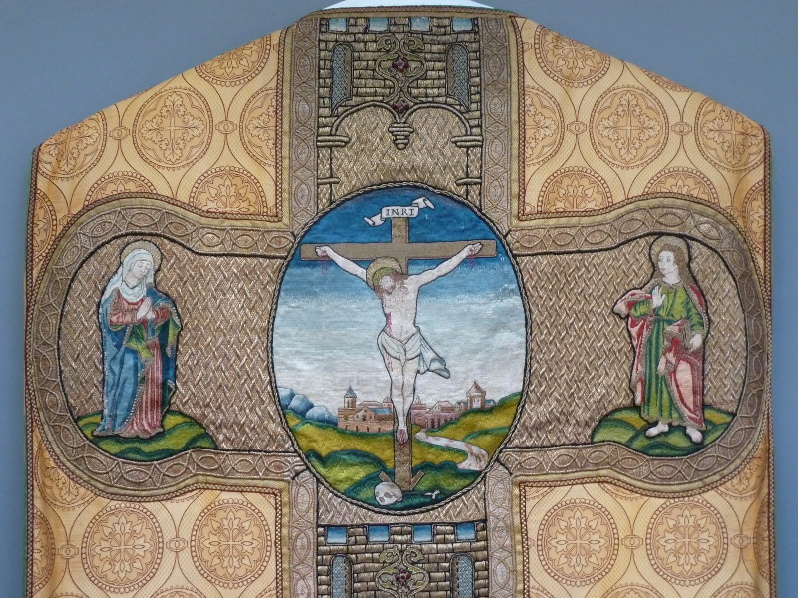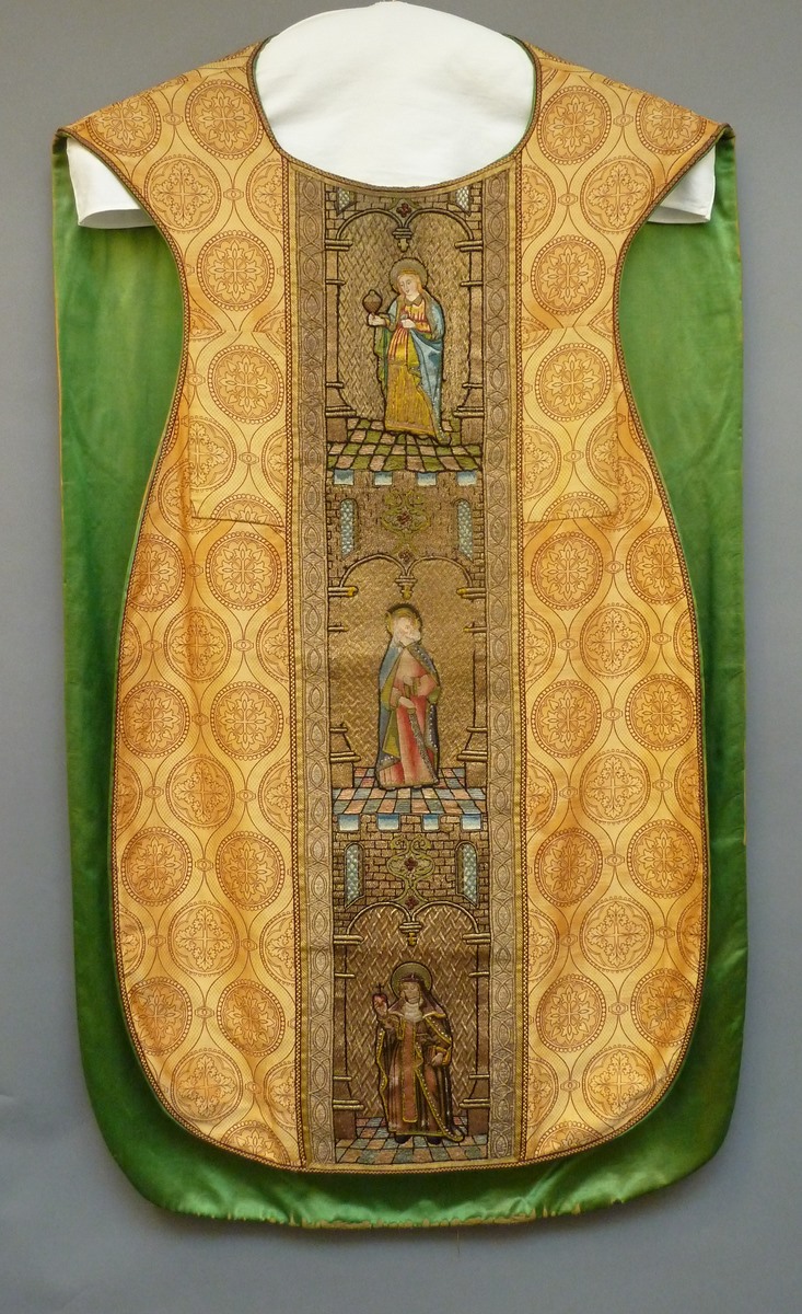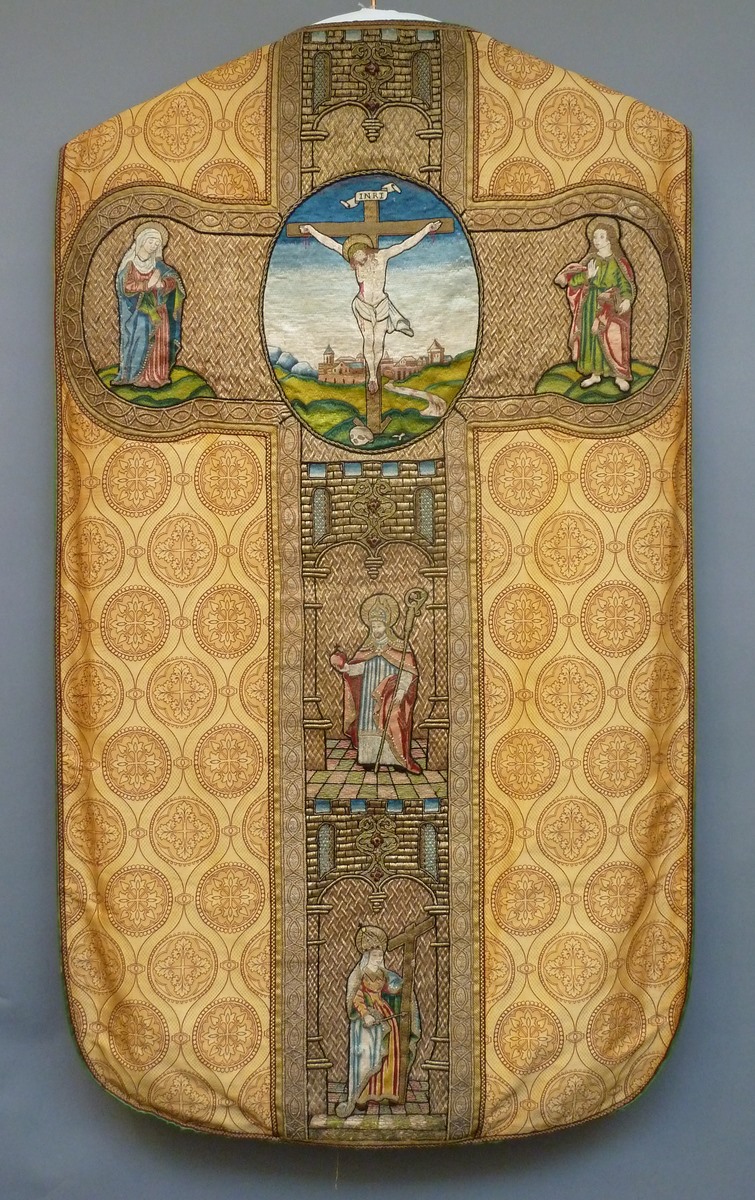 Goudkleurig kazuifel met kruisiging in medaillon, heiligen