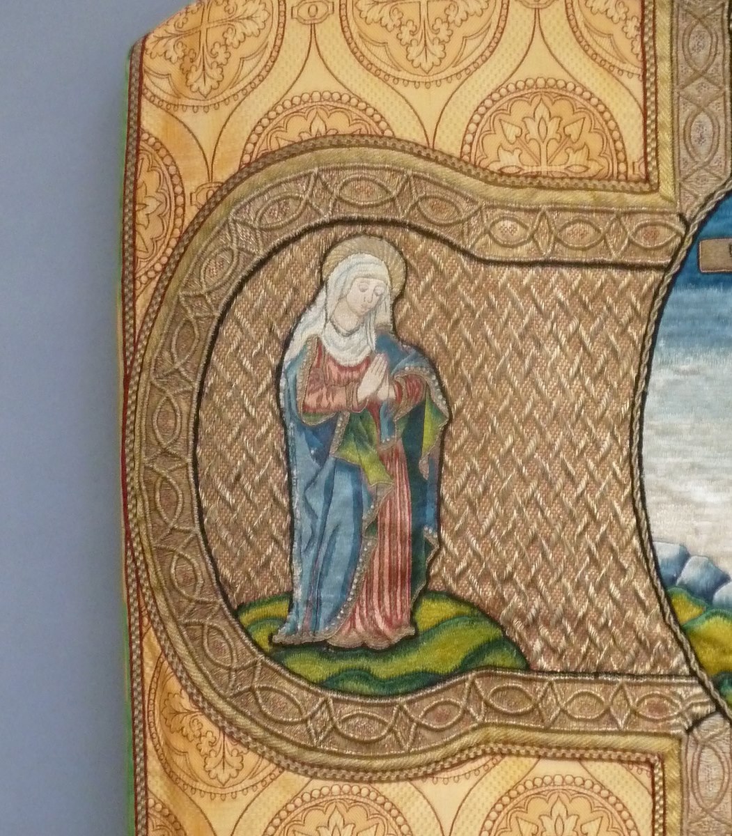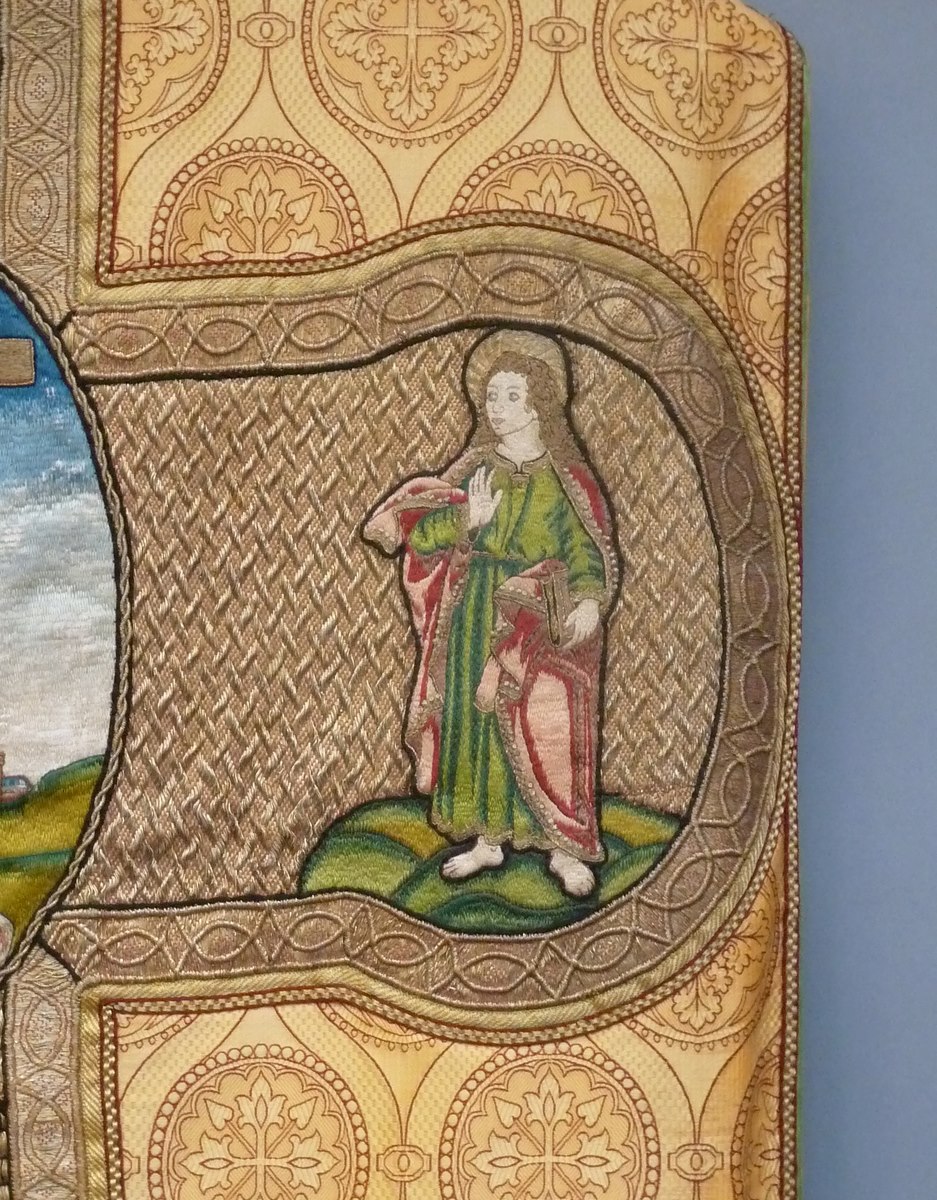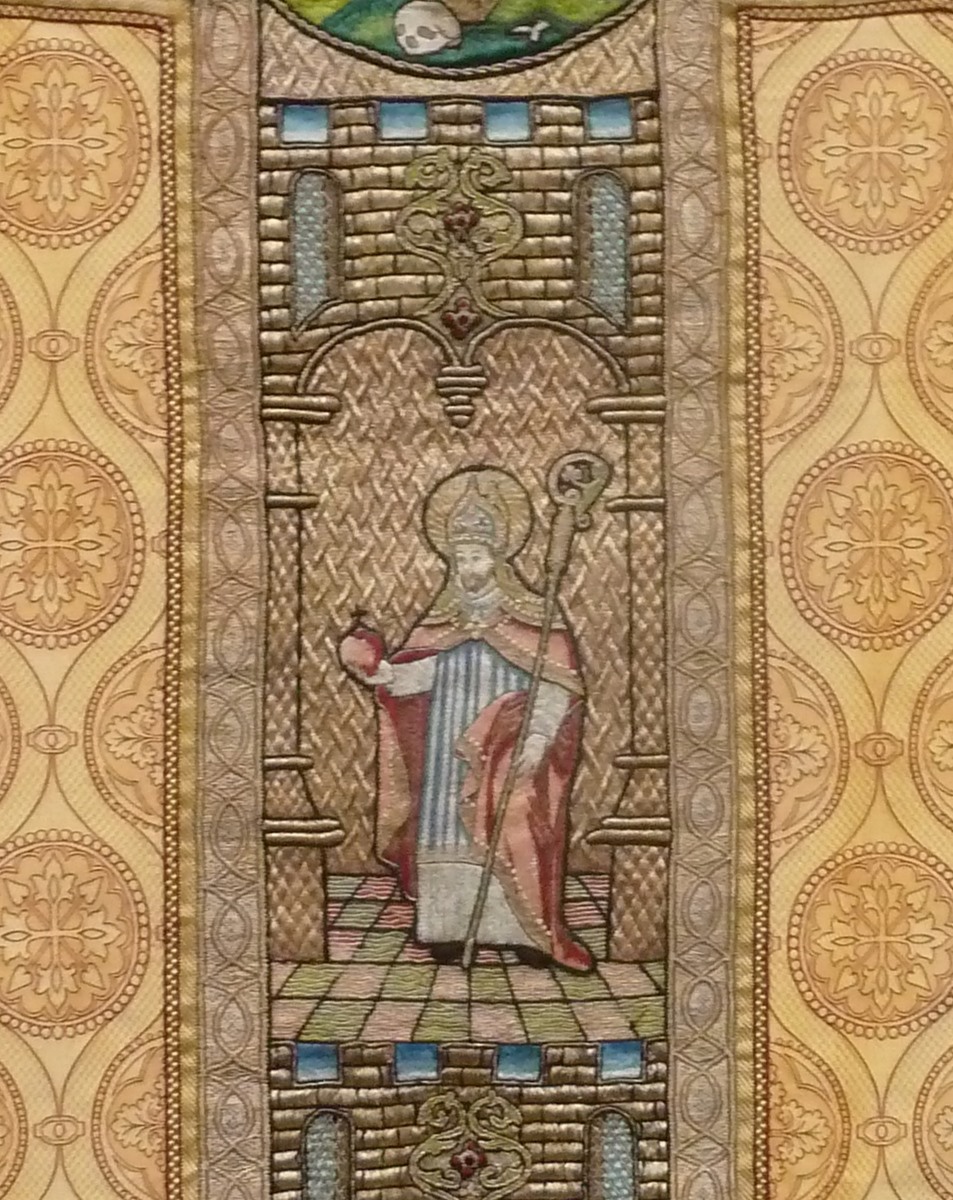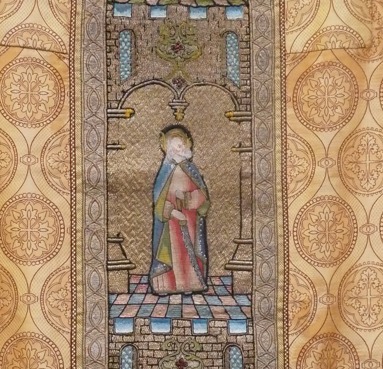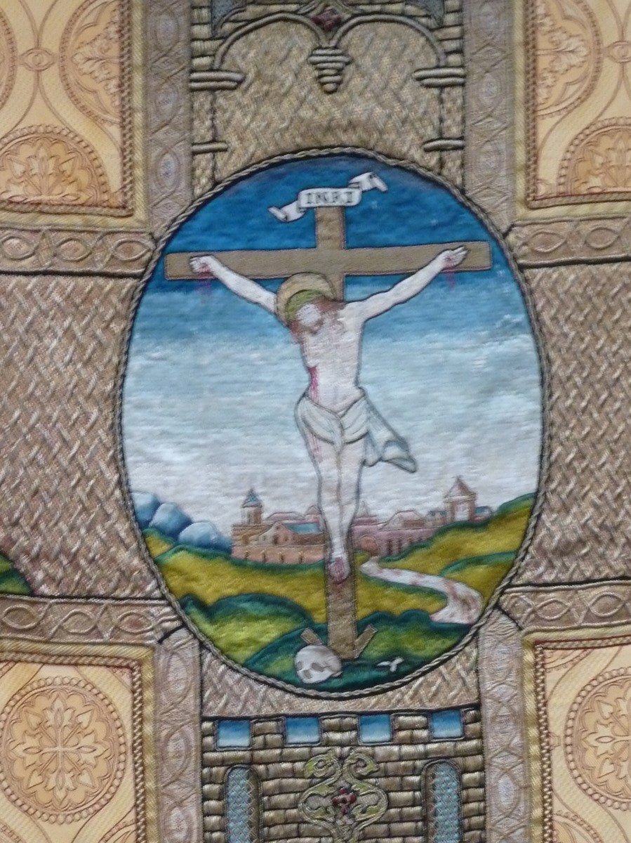 Goudkleurig kazuifel met kruisiging in medaillon, heiligen