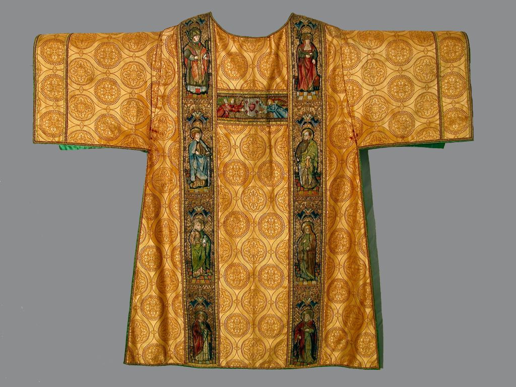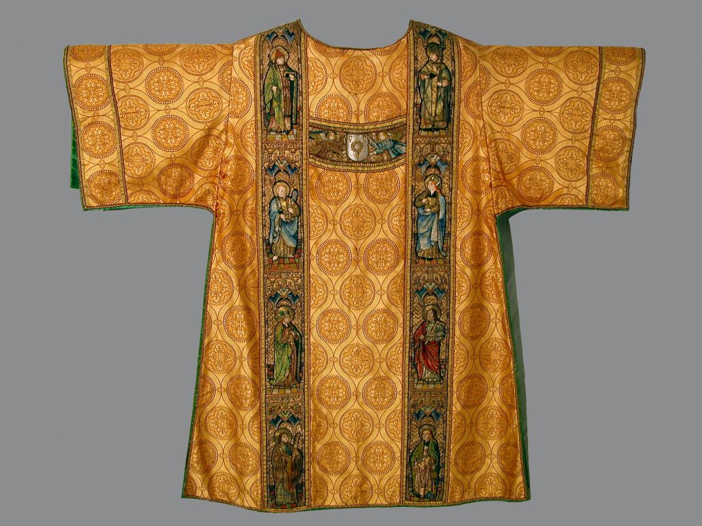 Goudkleurige dalmatiek met granaatappelpatroon, aurifriezen met heiligen en wapenschild