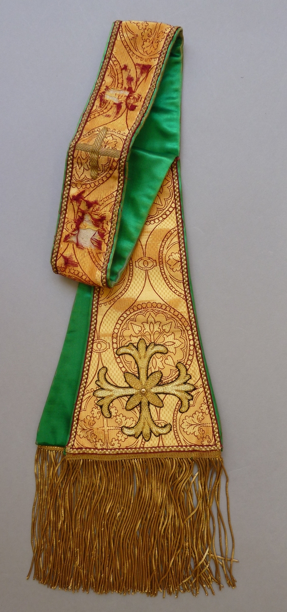 Goudkleurige manipel met ingeweven granaatappelpatroon, leliekruisen van gehoogd gouddraad