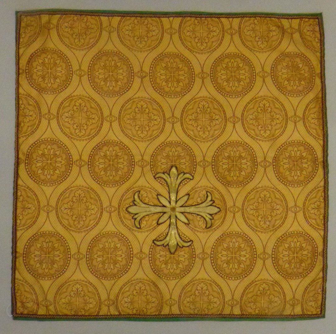 Goudkleurig kelkvelum met ingeweven granaatappelpatroon, leliekruis van gehoogd gouddraad