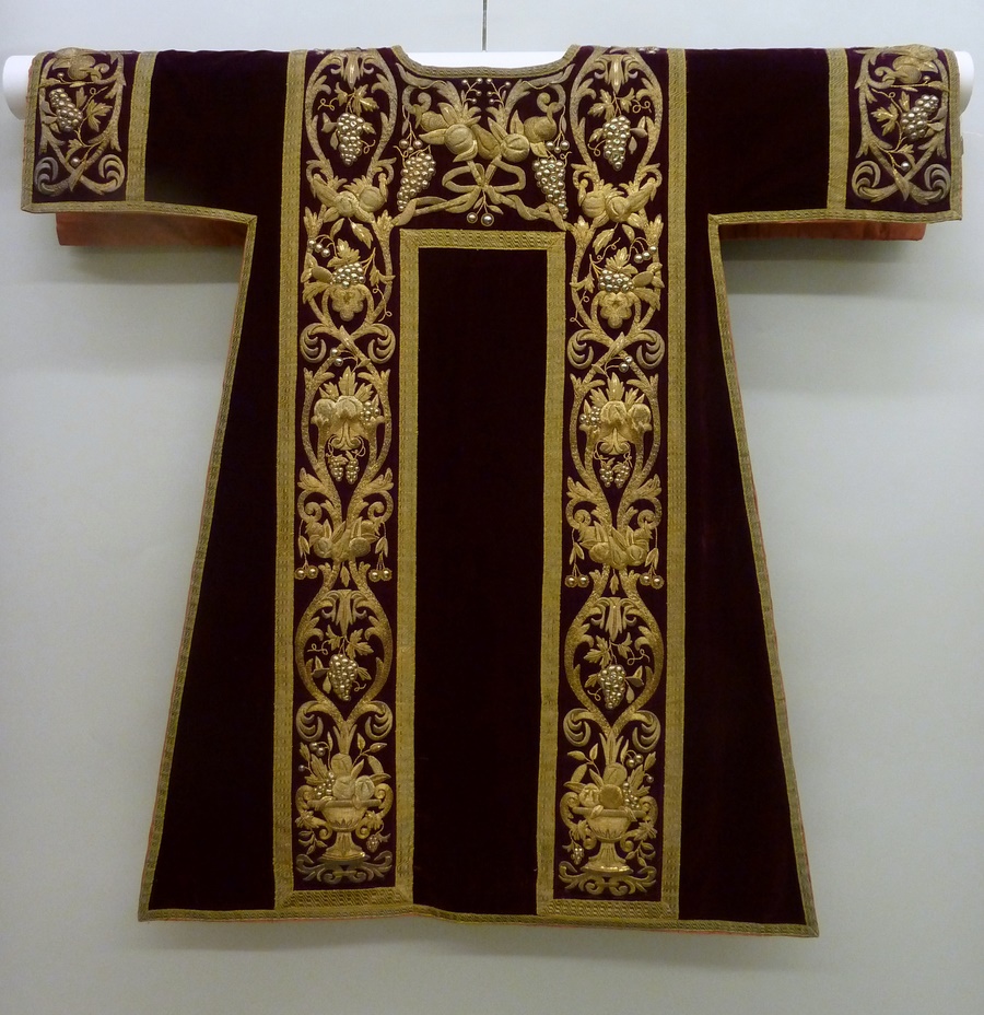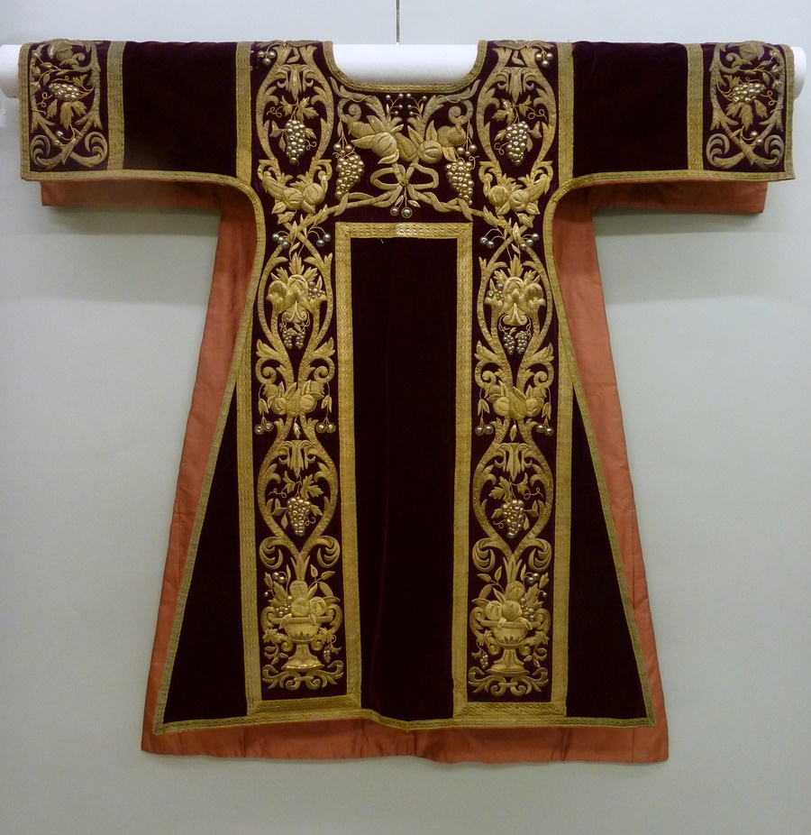 Rode dalmatiek geborduurd met wijnranken en granaatappels