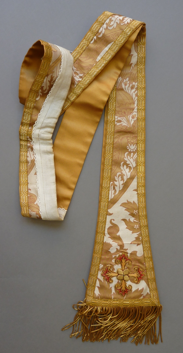 Witte stola met ingeweven goudkleurige granaatappelranken, geborduurde leliekruisen