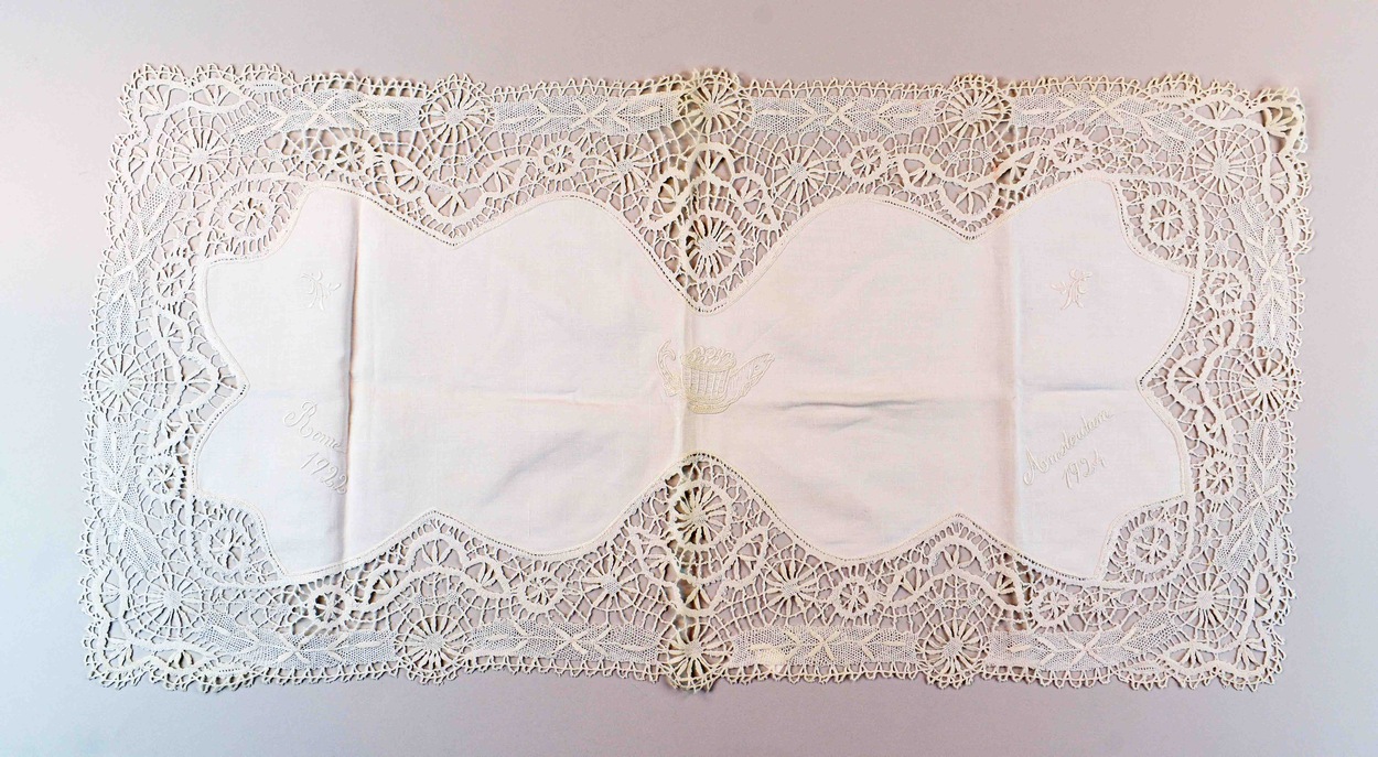 Credenskleed geborduurd met vis en broden, tekst "Rome 1922-Amsterdam 1924", afgezet met Cluny kant