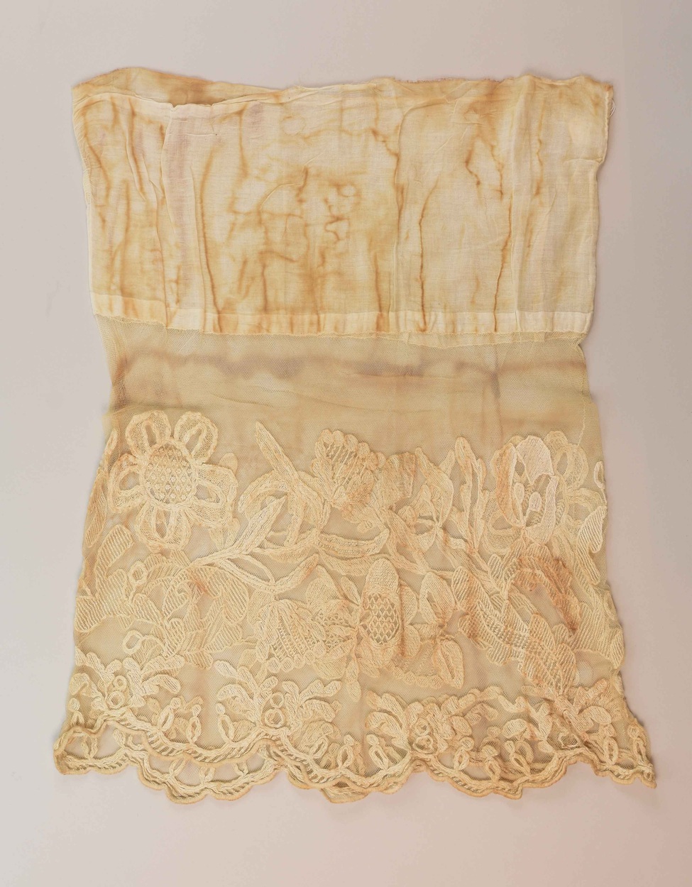 Mouw van een superplie afgezet met doorgestopte tule met bloemranken