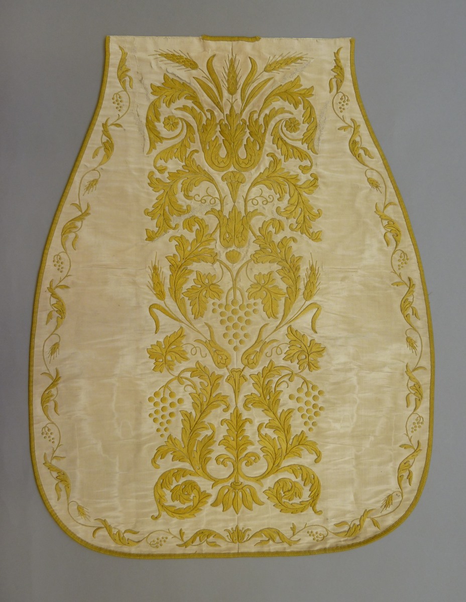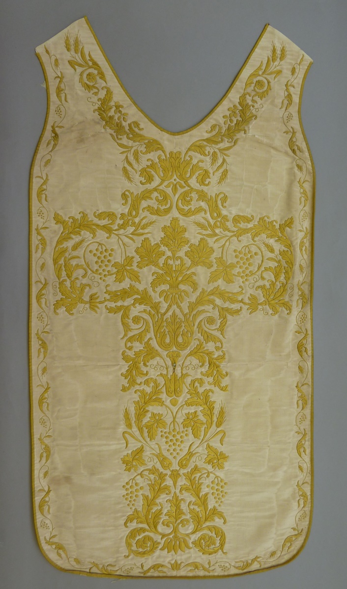 Wit, verknipt kazuifel in twee delen met geel borduurwerk van druivenranken en aren