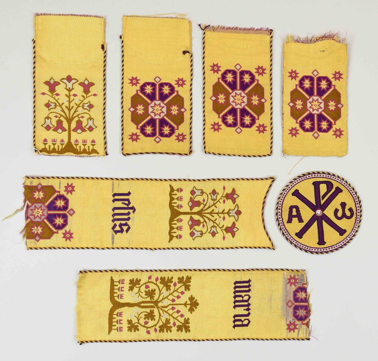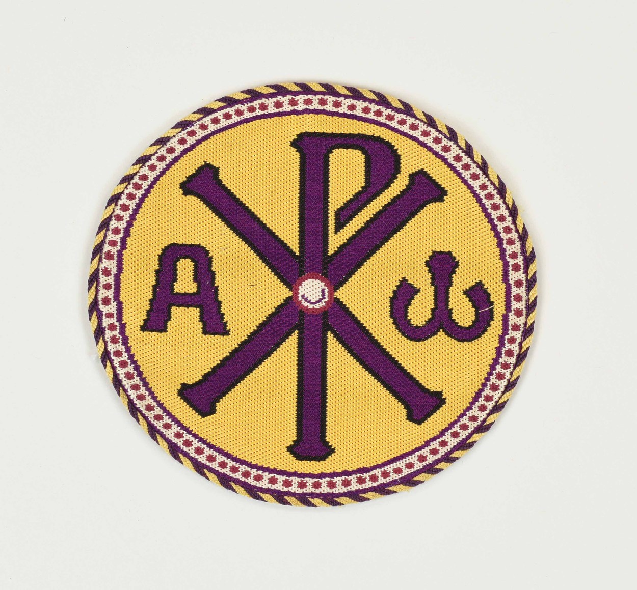 Gele imitatie-Kölner Borte: rond fragment met alfa en omega en Christusmonogram