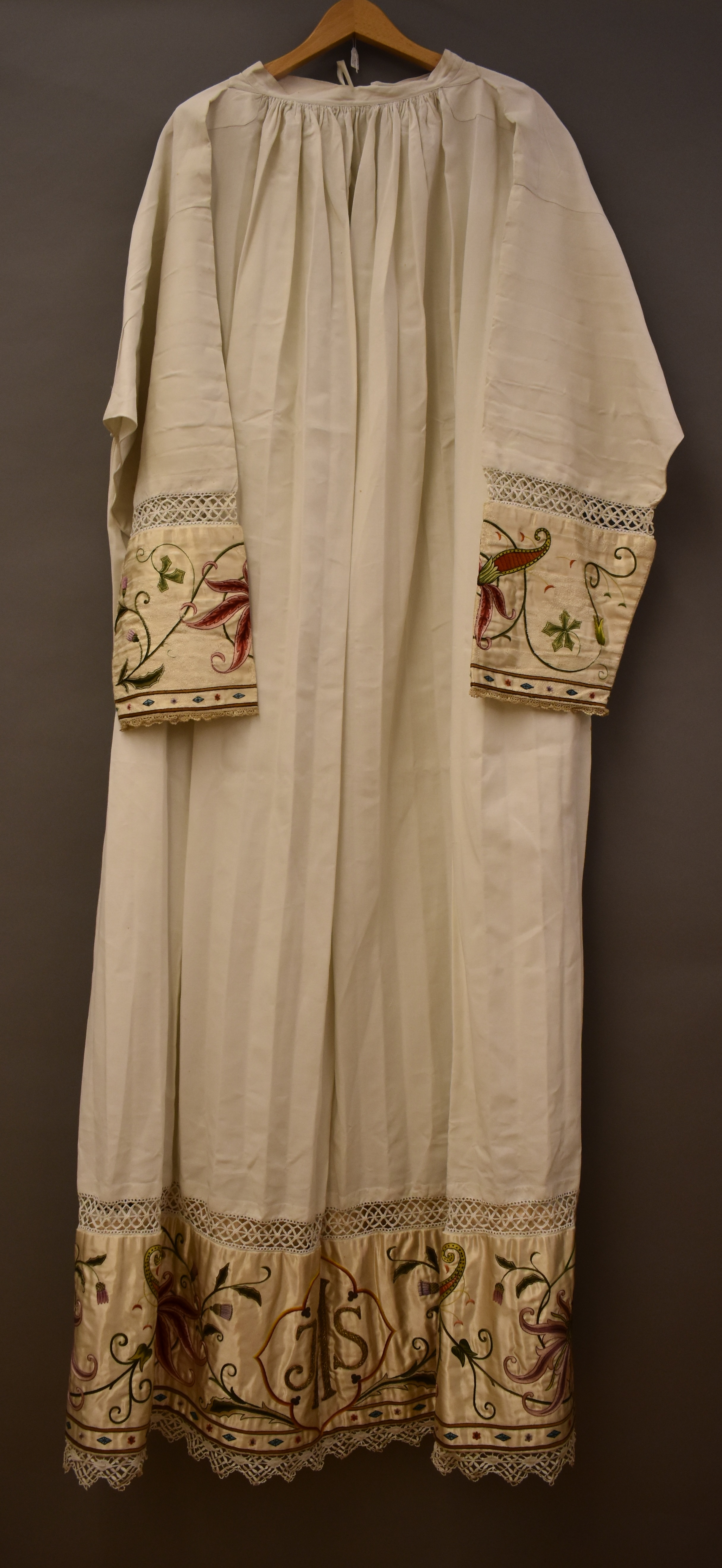 Albe afgezet met geborduurde zijden strook met PX en distelranken