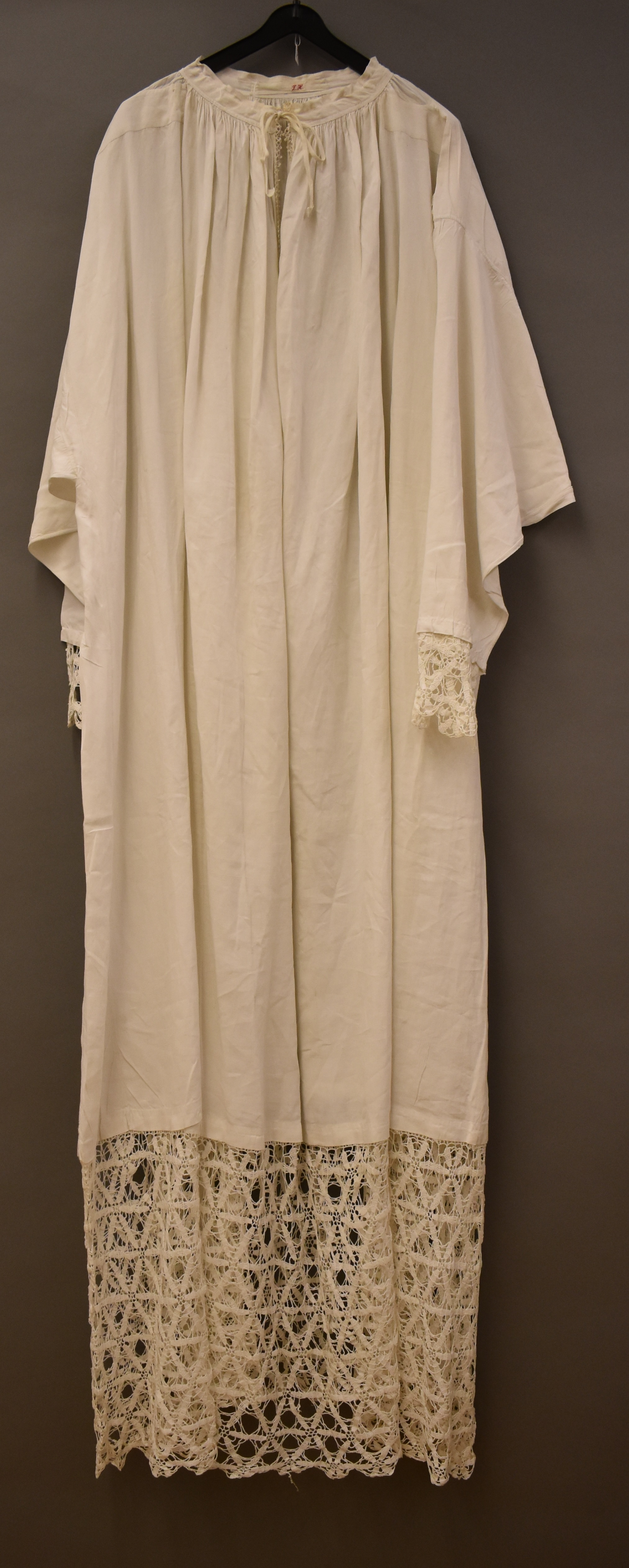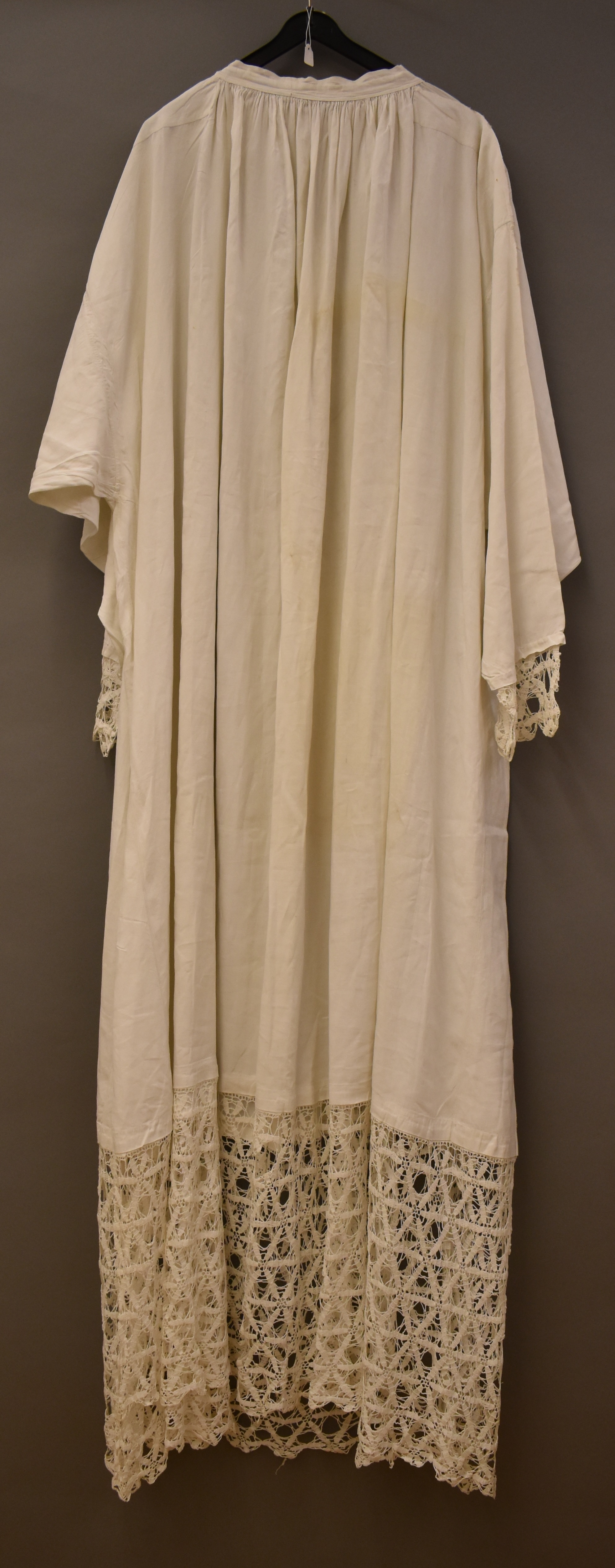 Albe met grove, gehaakte kantrand, langs hals frivolité, met initialen "LH"