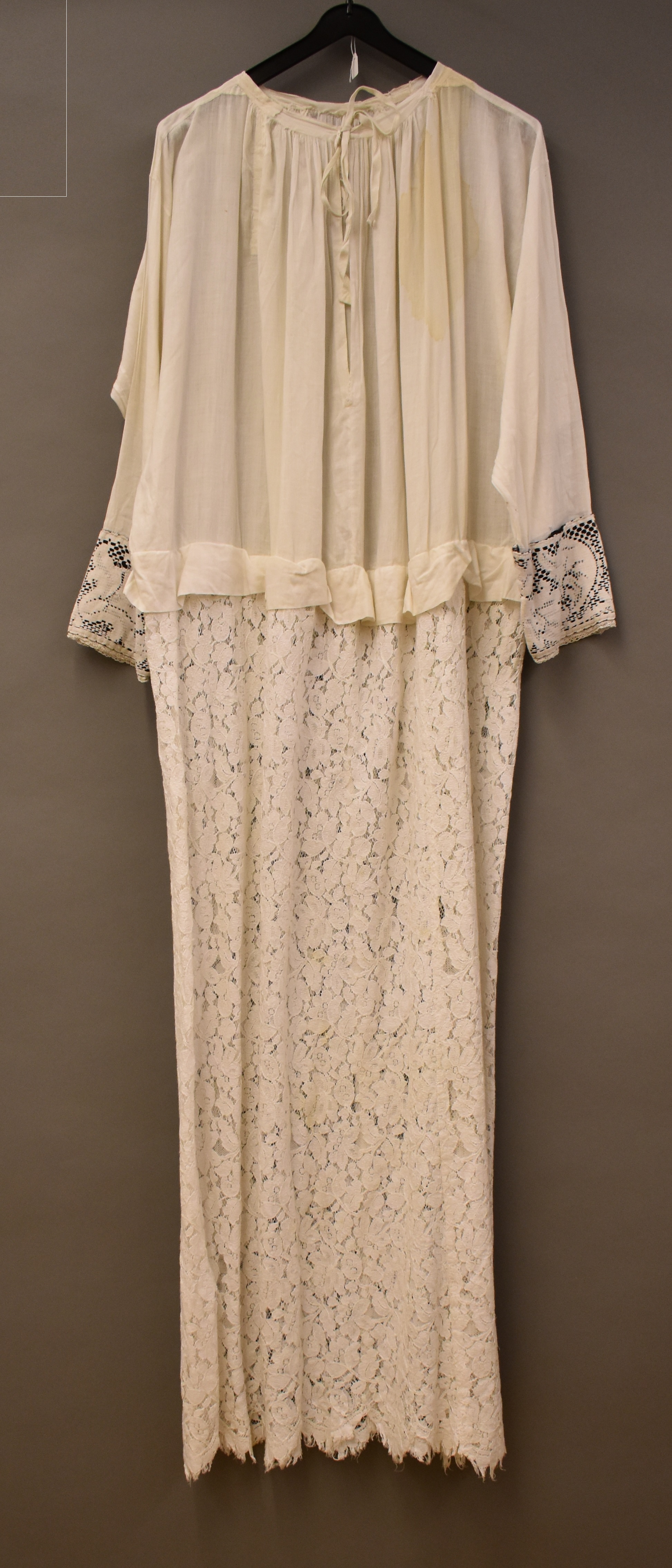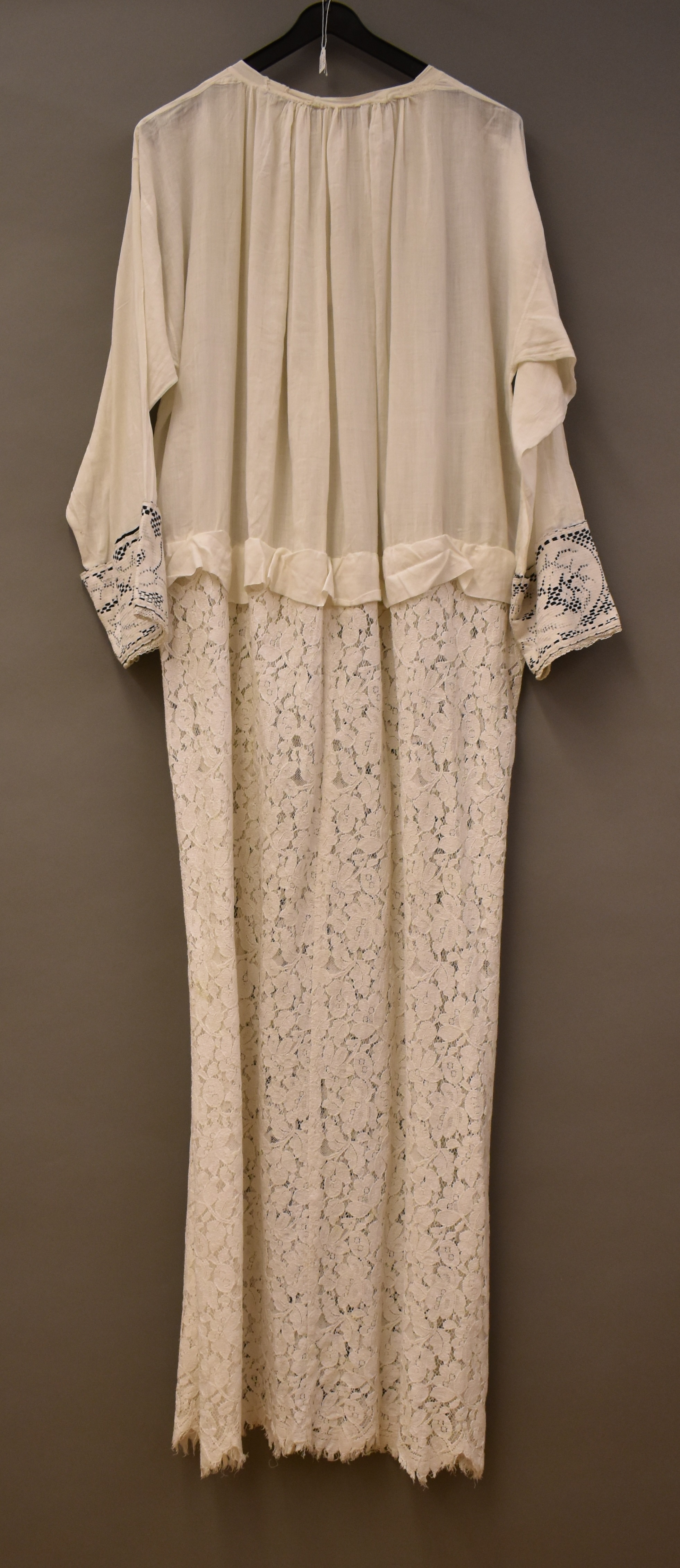 Albe afgezet met brede rand machinale kant, idem filetwerk gevoerd met zwart