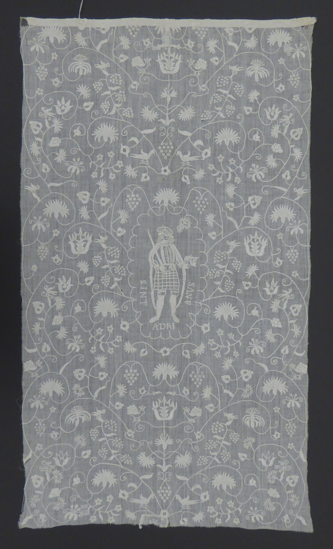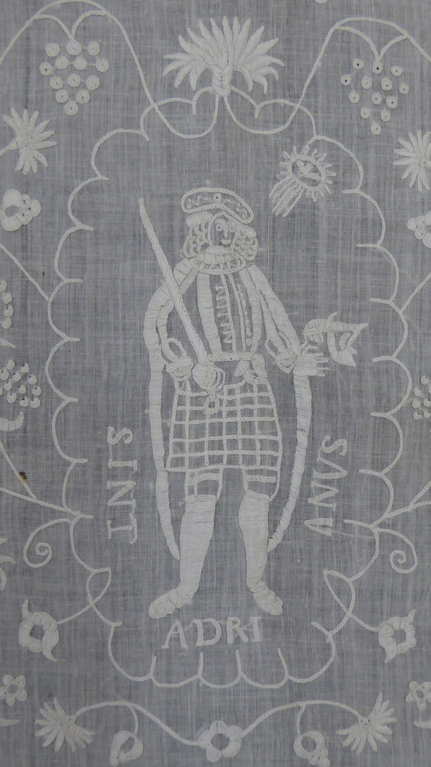 Borduursel van witwerk met H. Adrianus omgeven door bloemranken en vogels