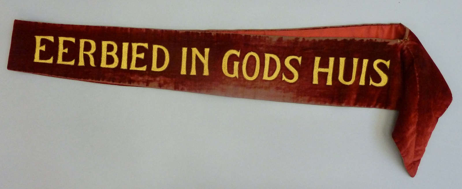 Rode sjerp voor ordebewaarder met "Eerbied in Gods huis"