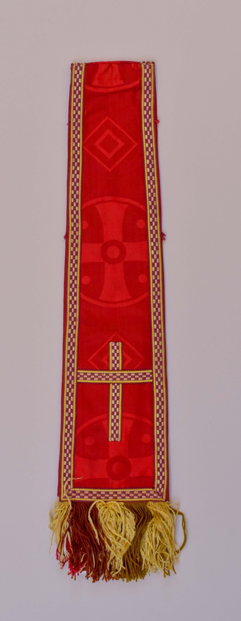 Rode kinderstola met ingeweven kruis in medaillon, afgezet met rood-geel geblokt galon
