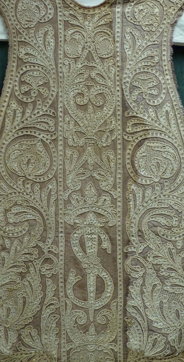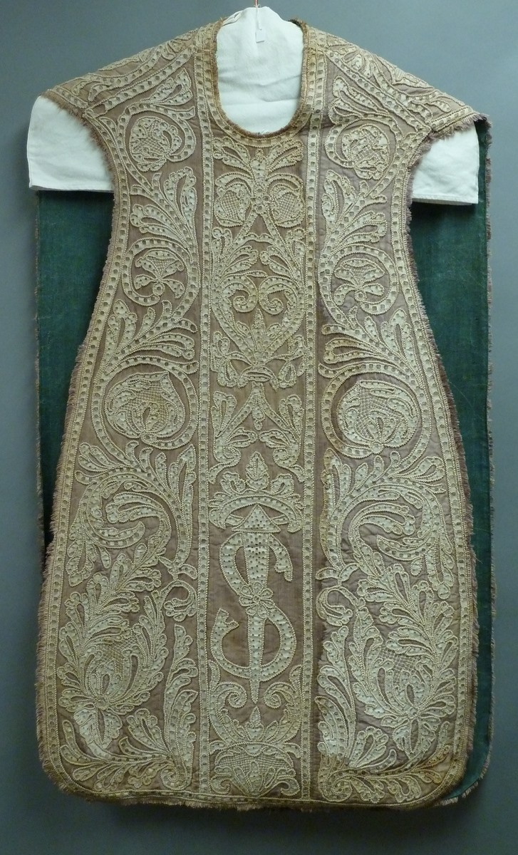 Planeta plicata (vastenkazuifel) met bloemmotief, letter S met spijker en kroon