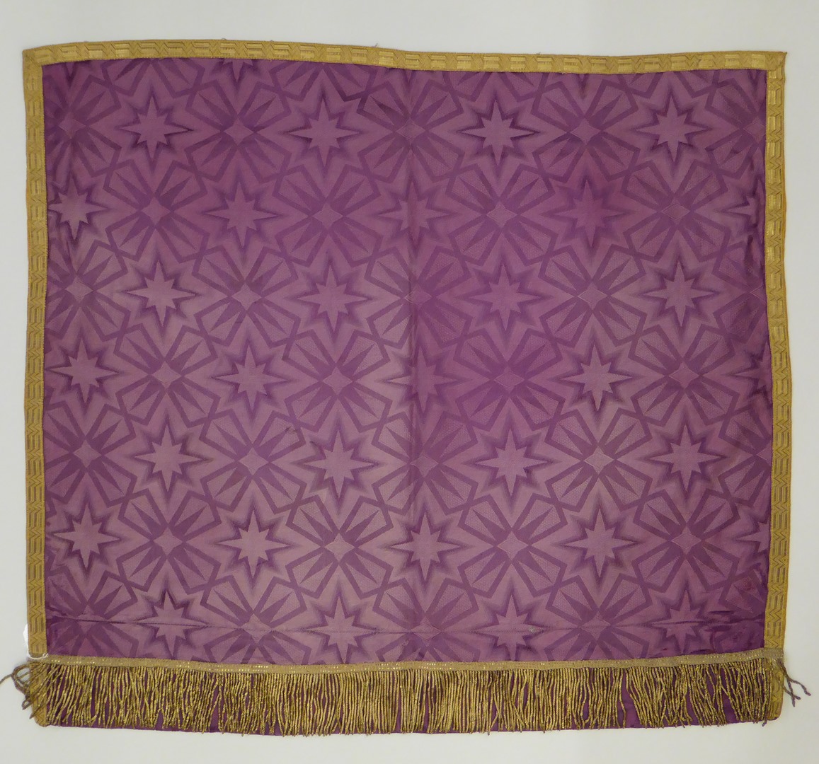 Paars tabernakelgordijn met ingeweven sterren en rand van goudgalon en goudfranje