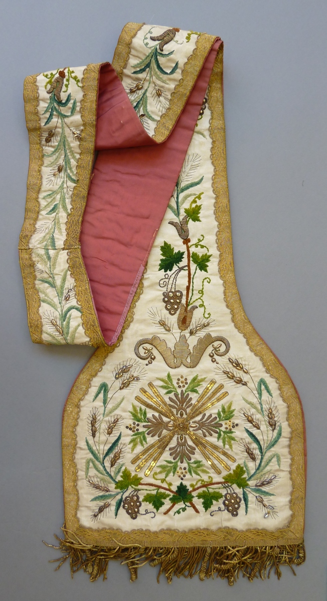Witte stola, breed uitlopend, geborduurd met druiventrossen en korenaren