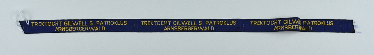 Donkerblauw lint met drie maal "Trektocht Gilwell S. Patroklus, Arnsbergerwald" in gele letters
