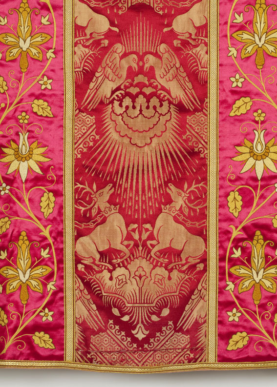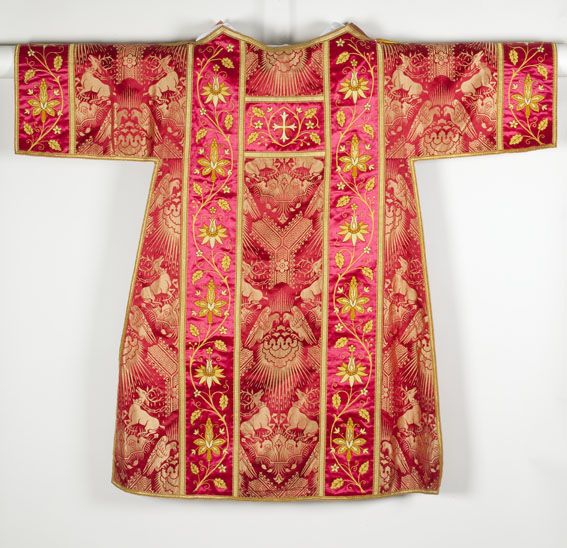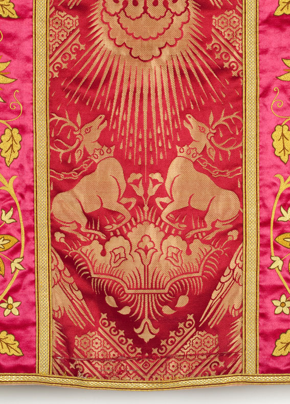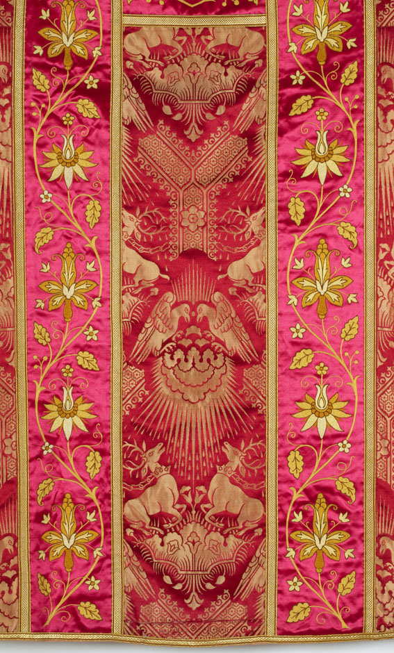 Rode dalmatiek met ingeweven gele herten en adelaars, geborduurd met bloemranken