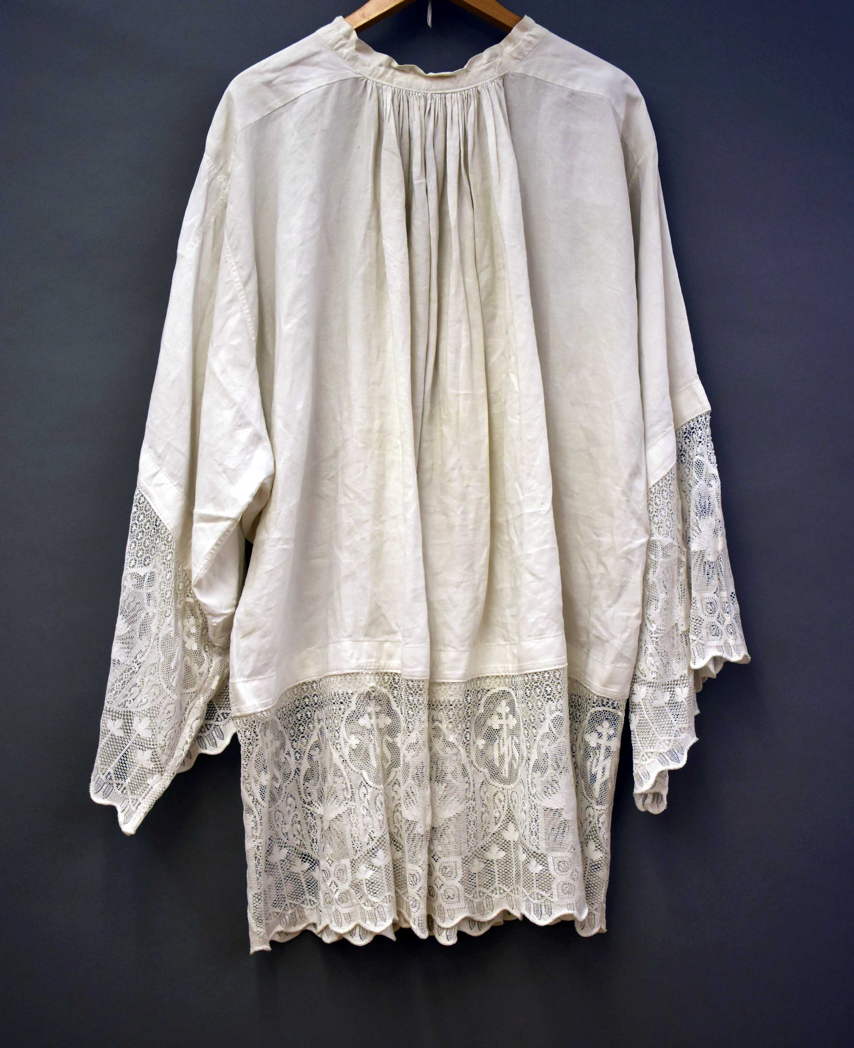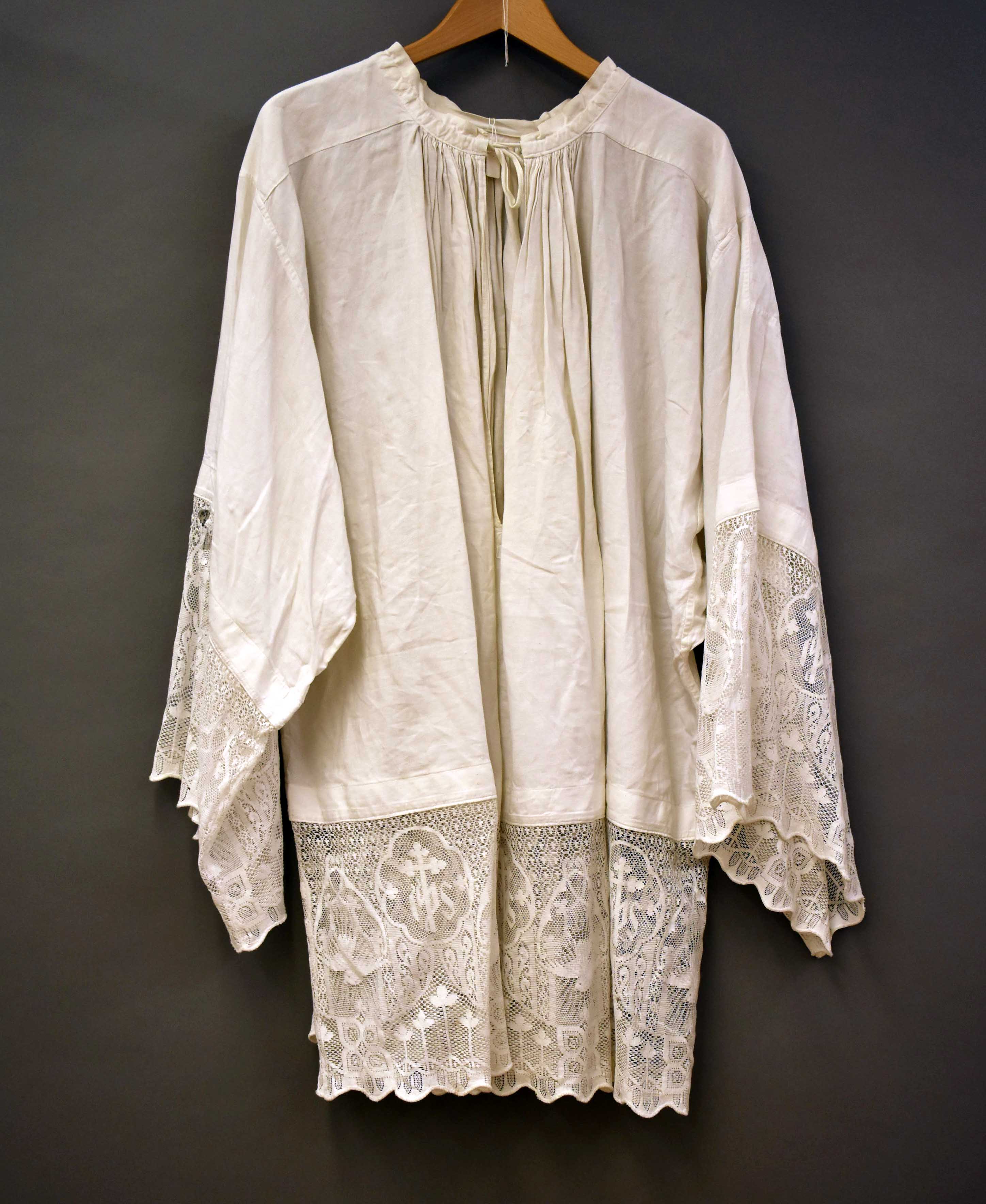 Superplie afgezet met machinaal filetwerk met duif en IHS