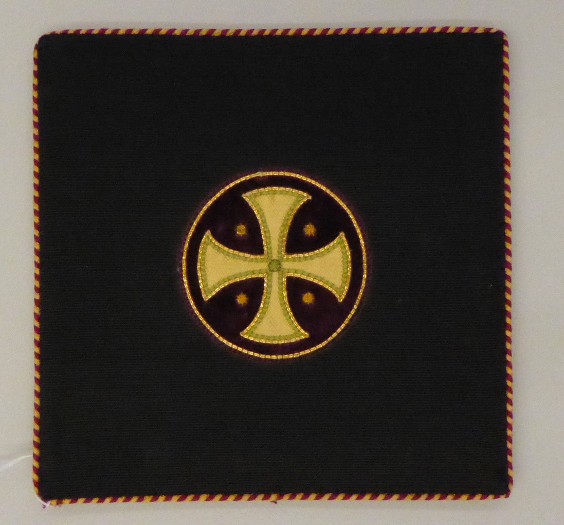 Zwarte beurs met geappliceerde kruisnimbus in paars en groen