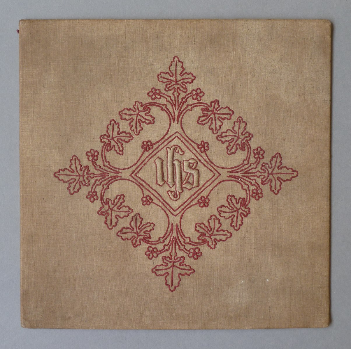 Witte (nu bruine) palla geborduurd met IHS in wijnranken