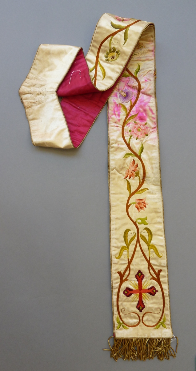 Witte stola geborduurd met roze en lila bloemranken en rode kruisen