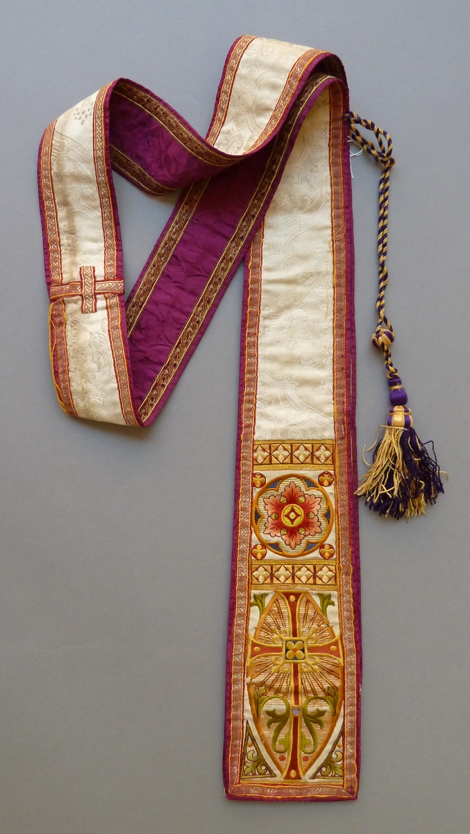 Paars-witte bedieningsstola met ingeweven lelies in vierpassen en geborduurde kruisen