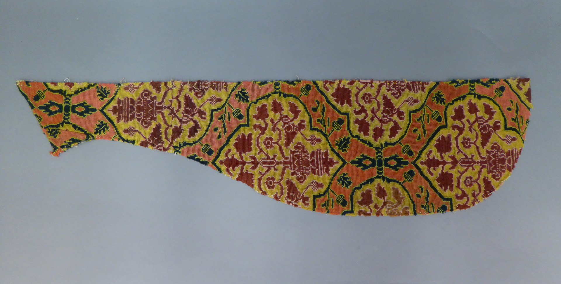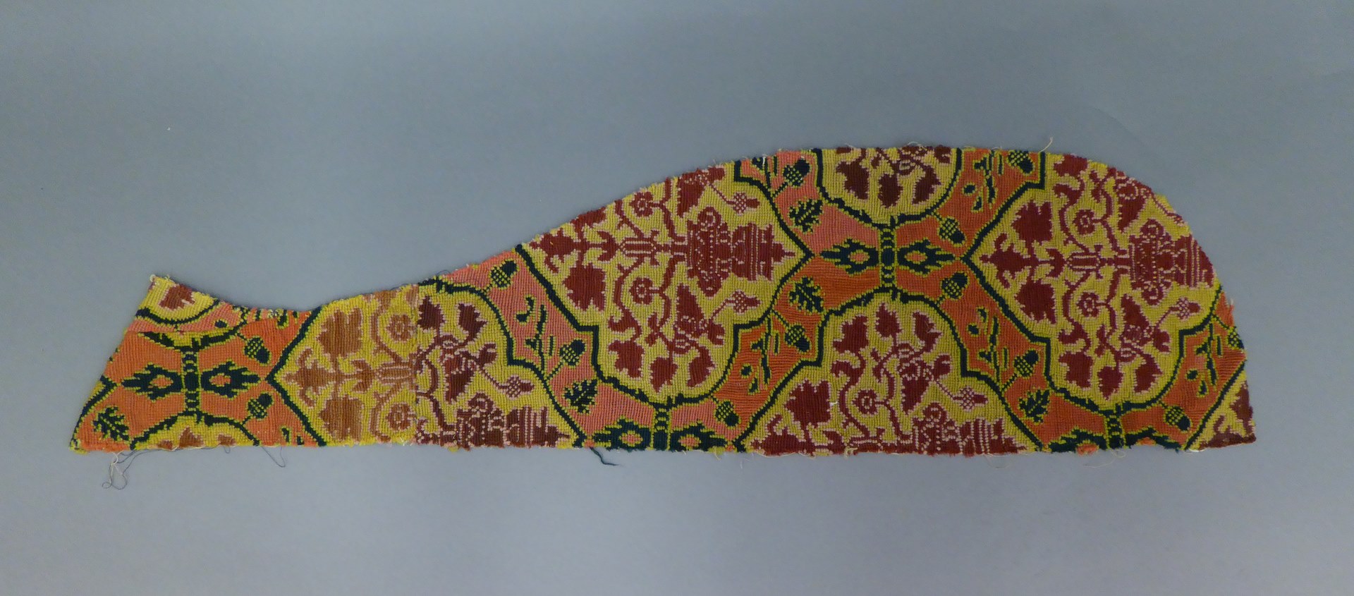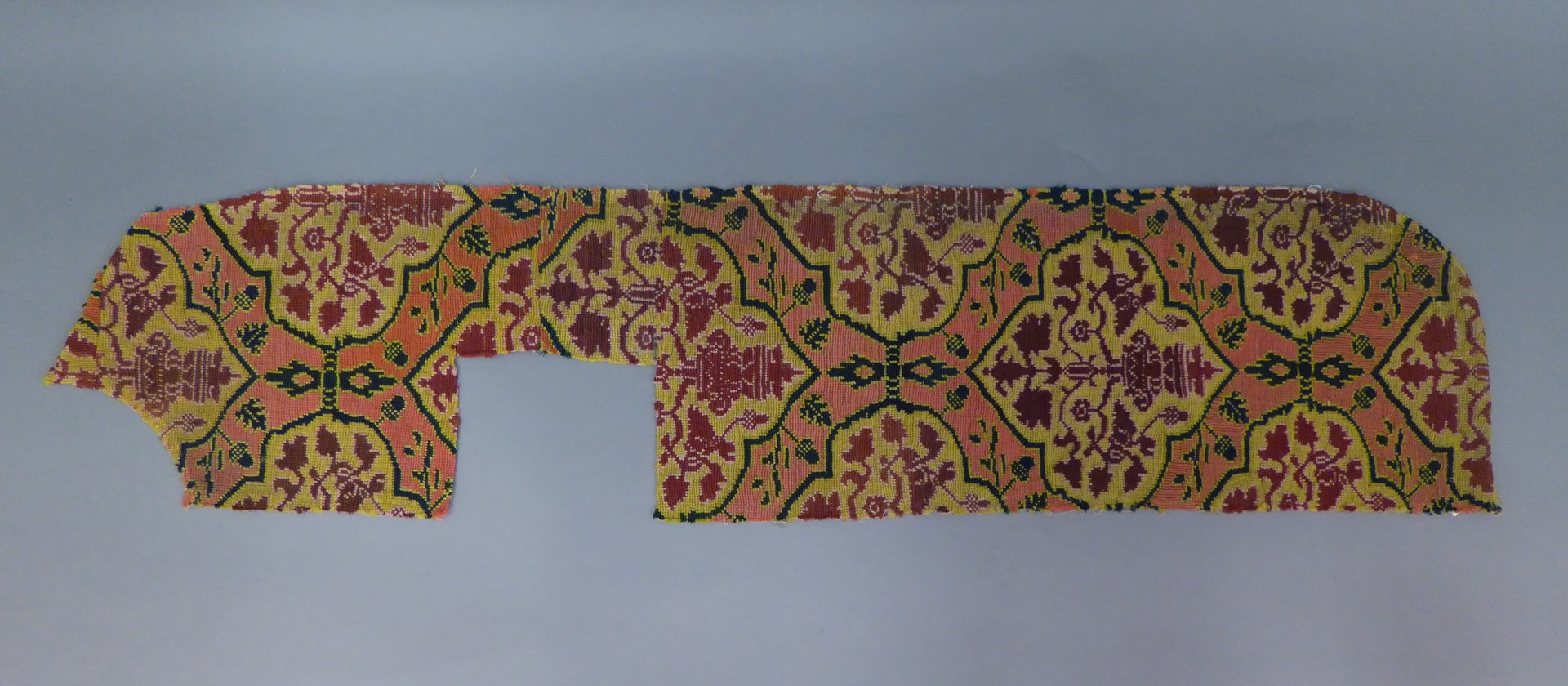 Tapisserie kazuifel (4 fragmenten), rood fond met gele vierpassen, waarin leliekruisen