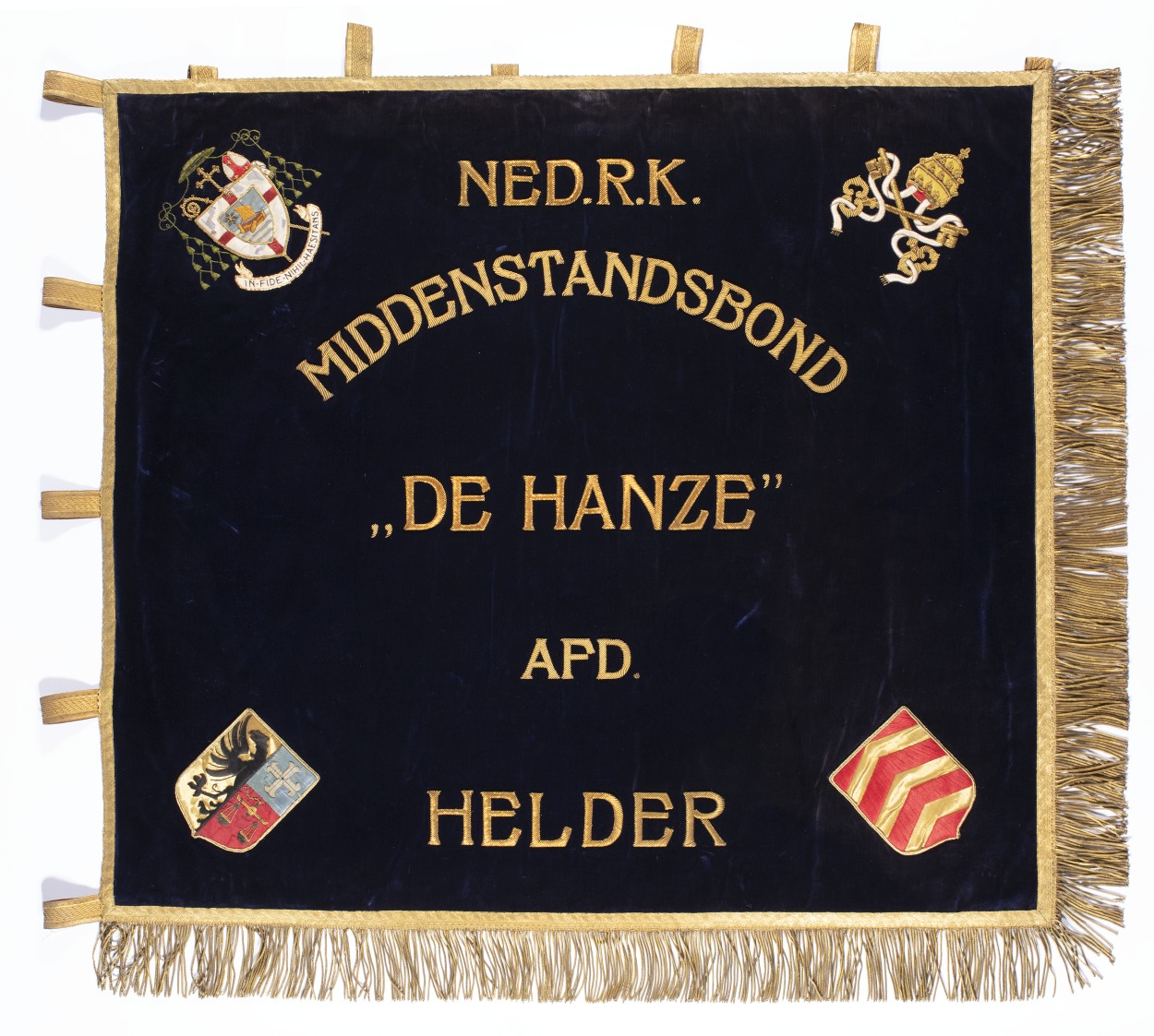 Blauw vaandel met vier wapens en met "Ned. R.K. Middenstandsbond "De Hanze" afd. Helder"