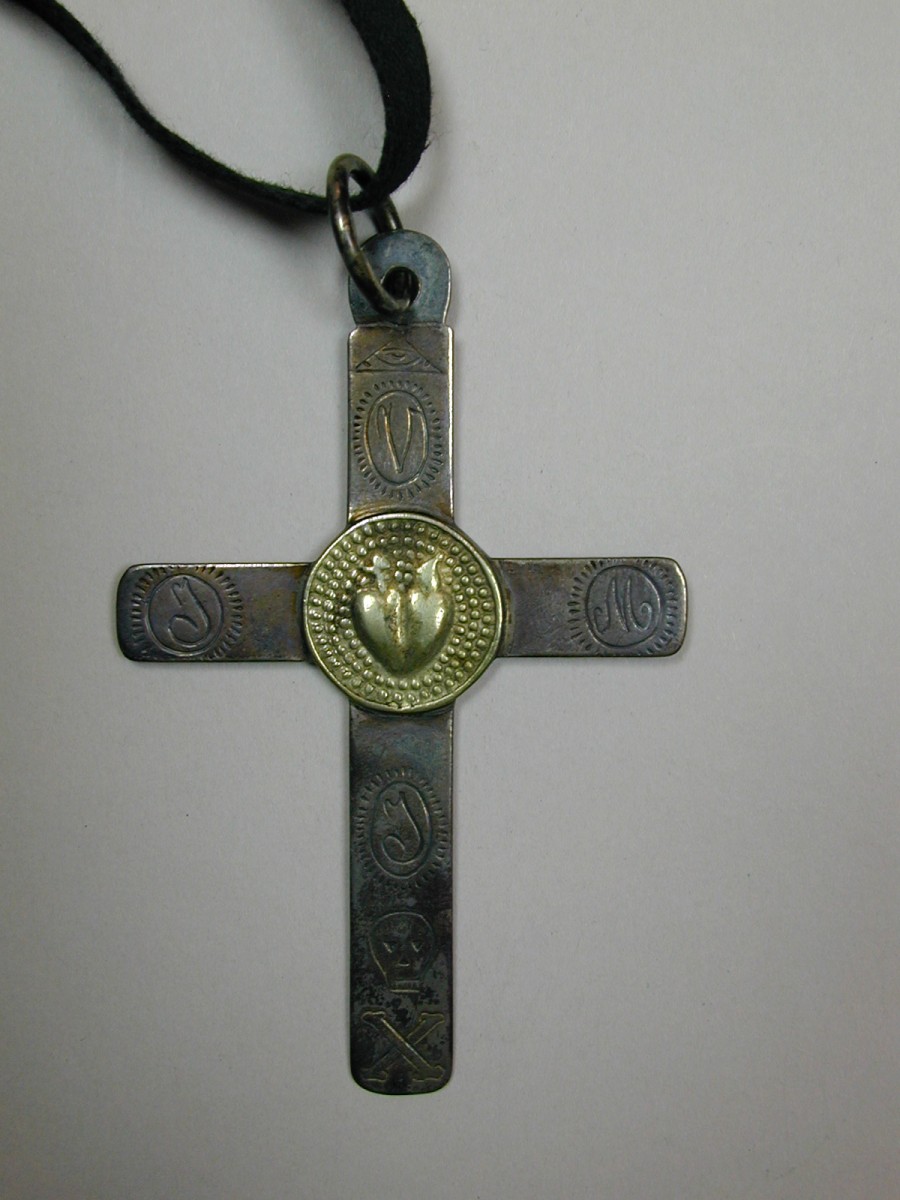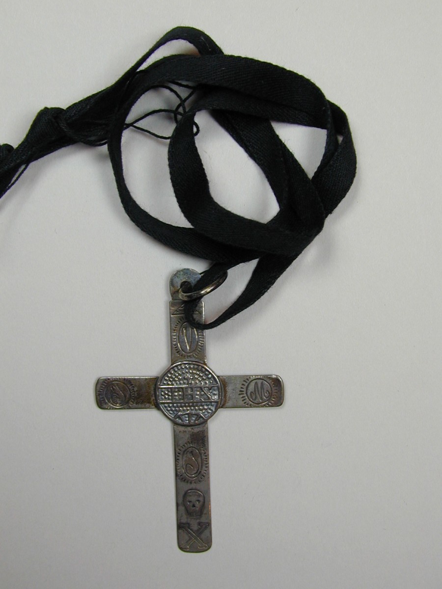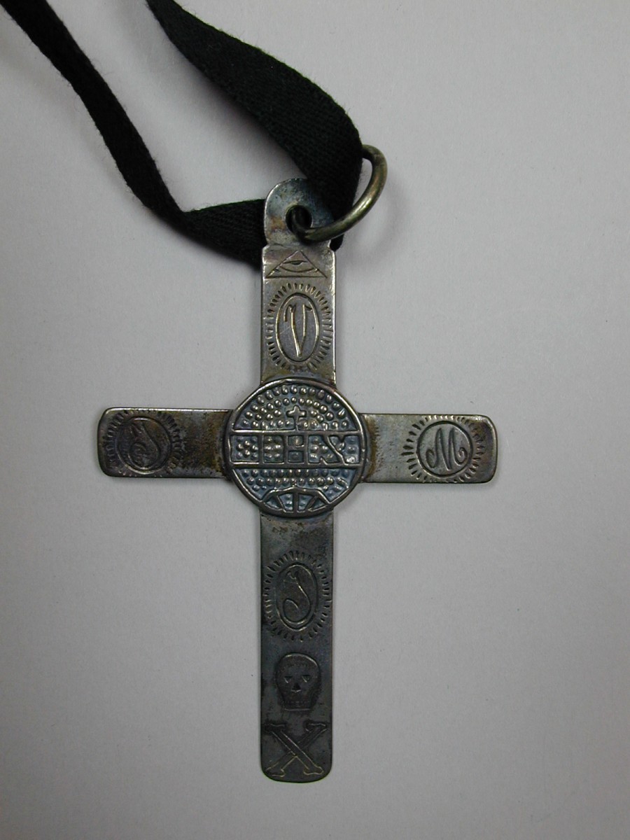 Ordekleding: kruisje met H. Hart, IHS en Alziend Oog aan zwart lint